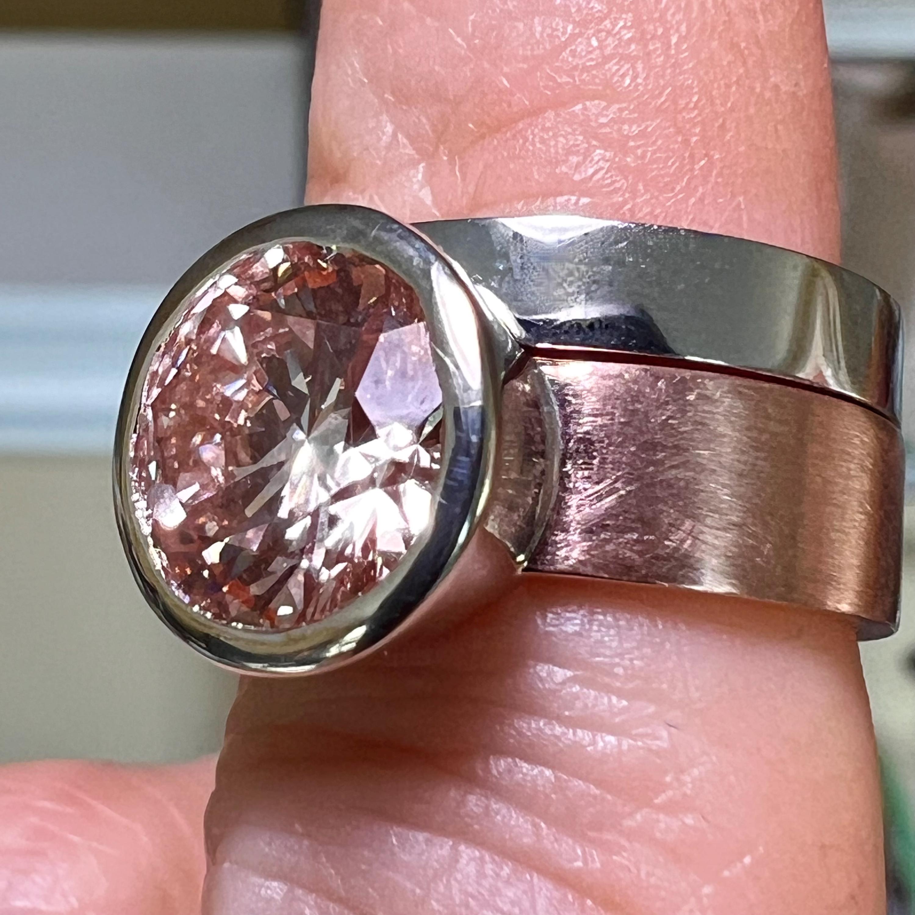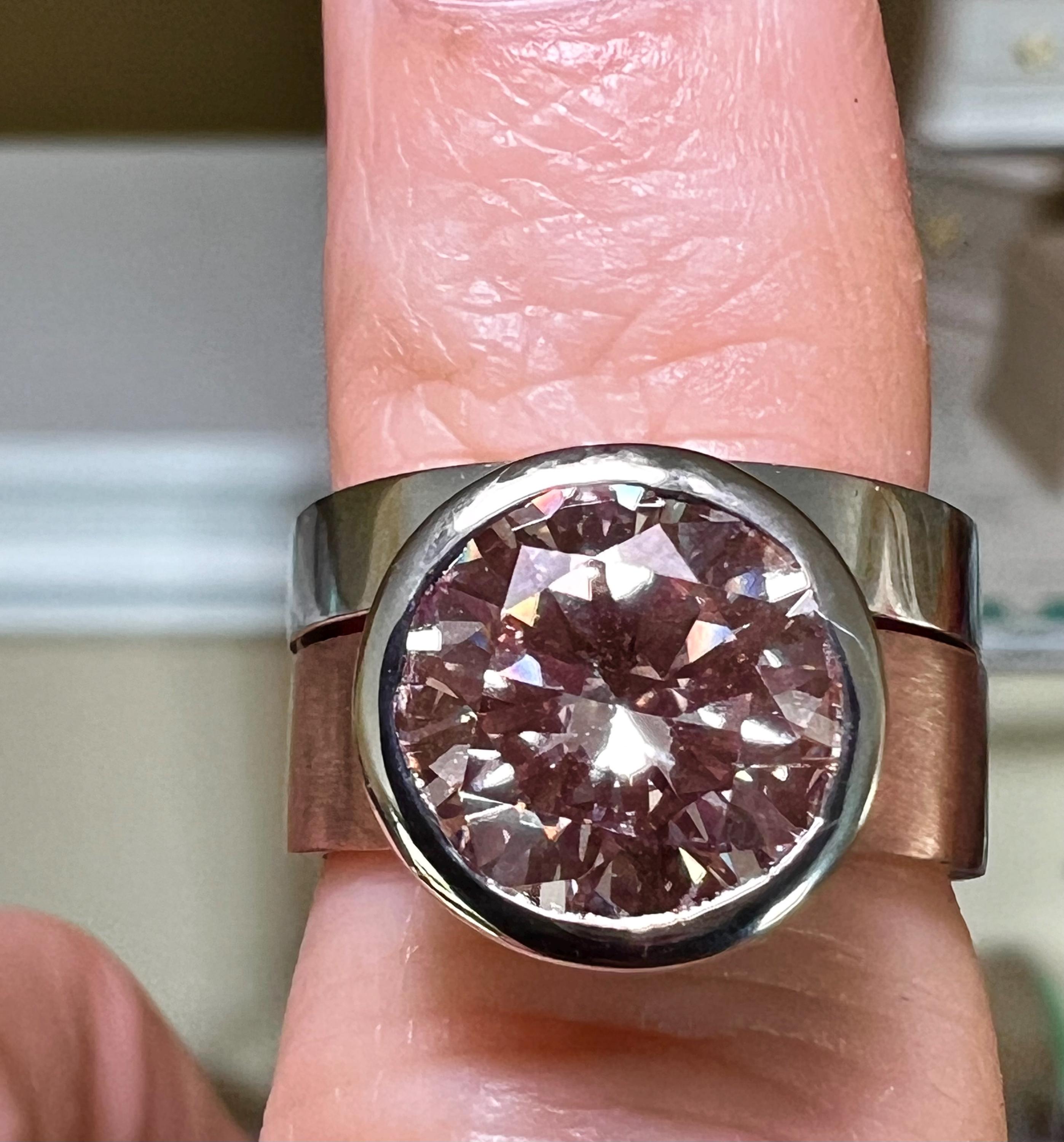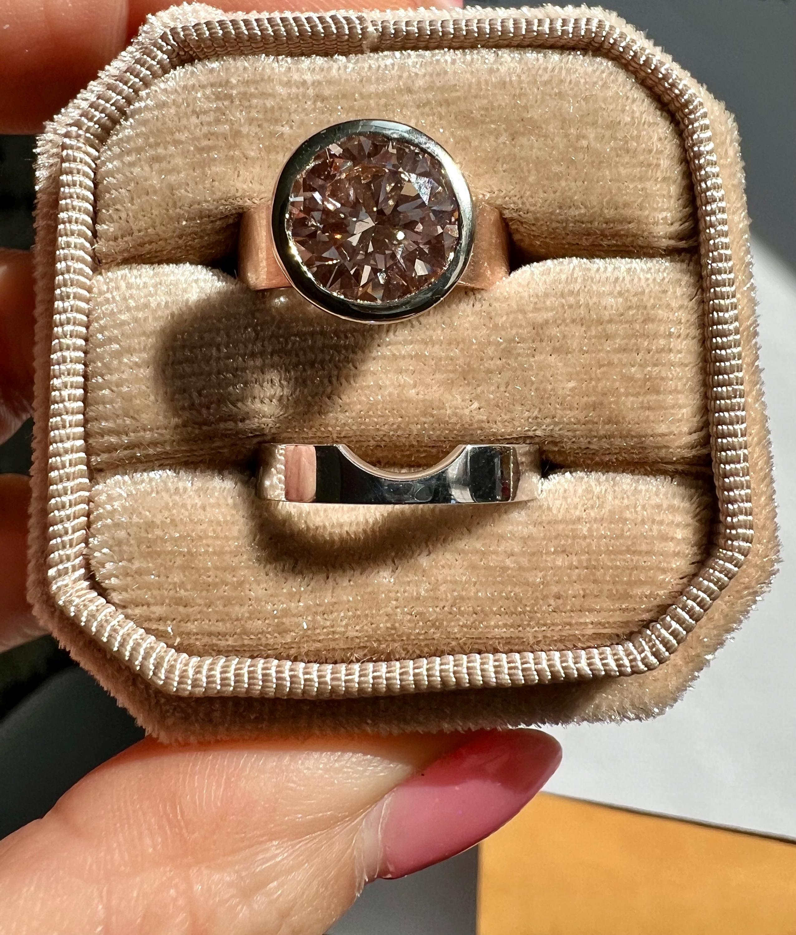 🪛This bridal set was created with the most wonderful client and now resides in Australia. A gorgeous 10K brushed pink, gold and polished white gold bridal set created to nestle together perfectly. The center is a 3.5 carat round brilliant cut, fancy intense pink diamond.