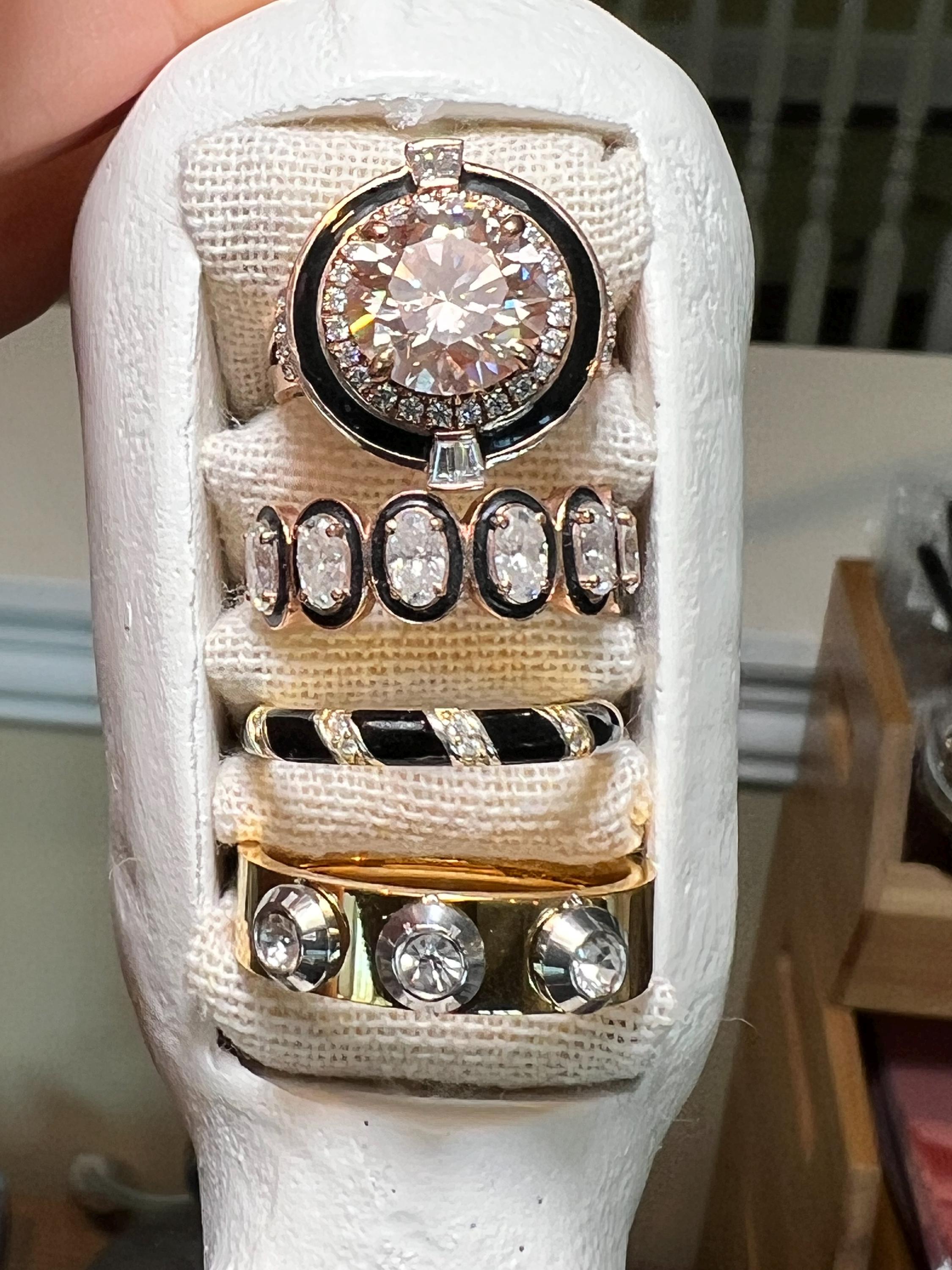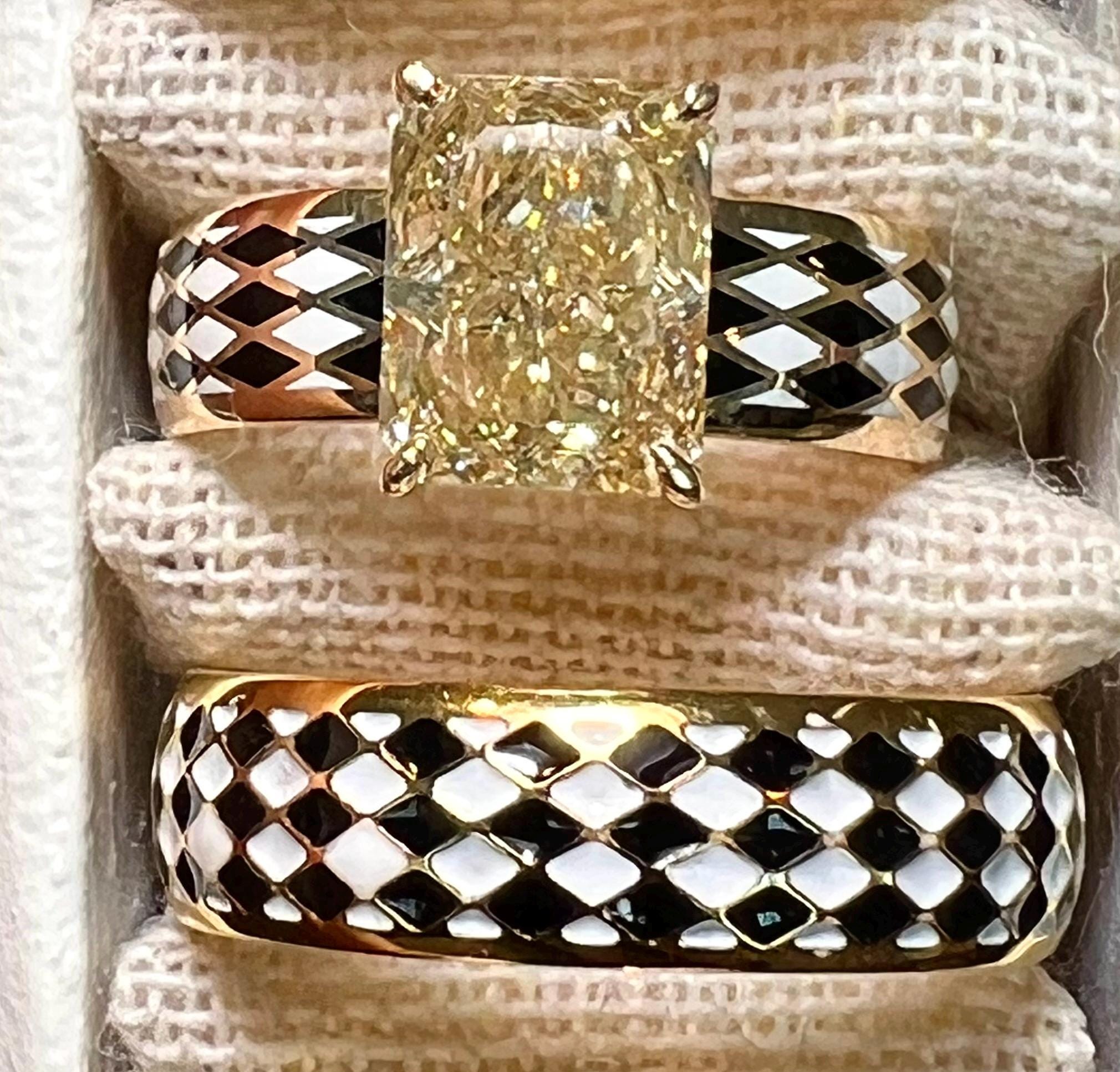 ⚜️Art deco with a bit of my own spin. We can do any color enamel for the checkerboard patterns. We can make the bands thin we could make them a bit thicker and you can have some fun stocking. Just messaged me and let's create.