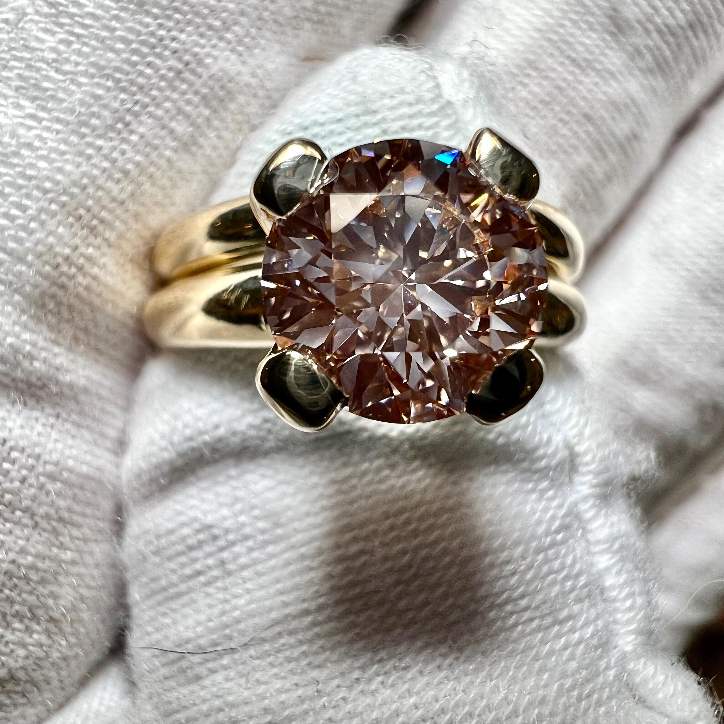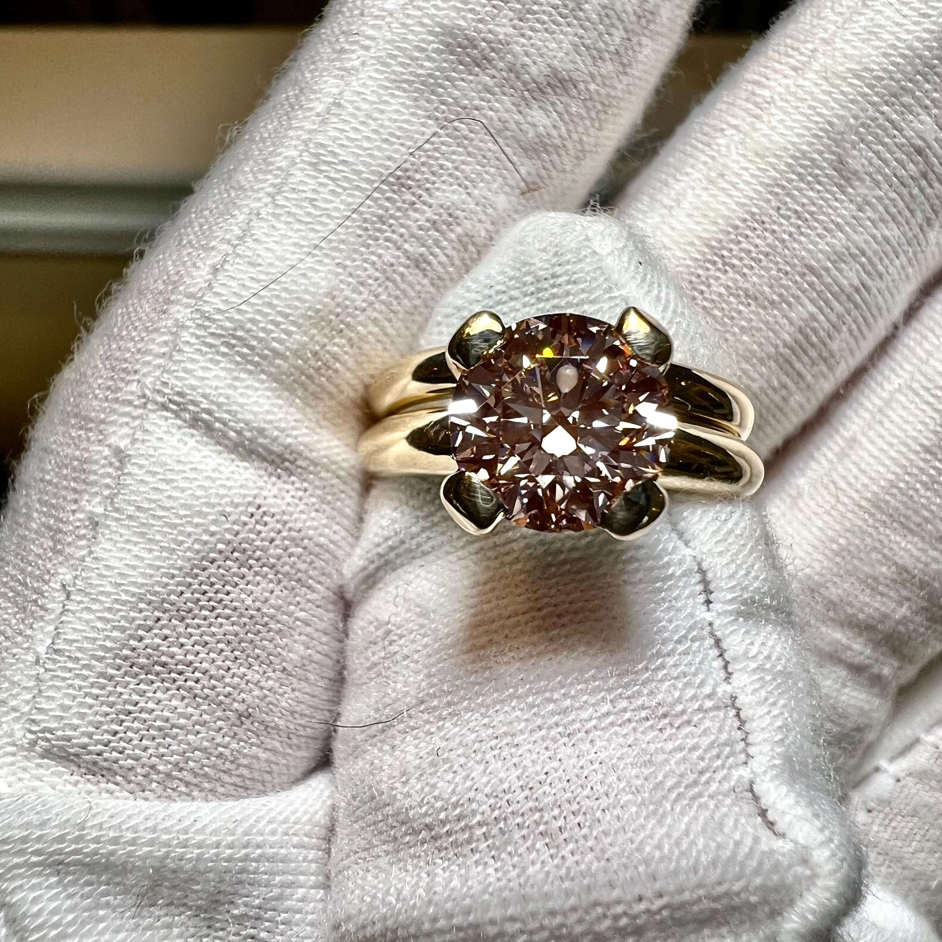 14K White Yellow Gold Bezel 2CT Round Brilliant Cut Fancy Intense Pink VS1 2EX Lab Grown Diamond Engagement Ring Bridal Set