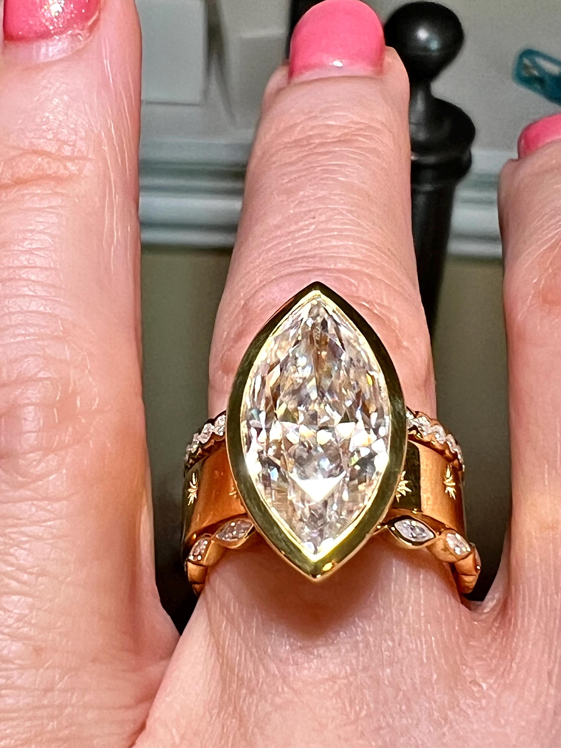 ⚜️ Please note that this is my original design and you will see it all over the Internet and Etsy having already been copied. Please 🙏 respect the original designer, me 🤗, and please purchase from me only. I thank you so much for that. Also, if you'd like any variations of the bridal set; whether it be a different diamond shape or optional variations of the mount, please let me know? I love customizing! One of my favorite variations I've done in the past for a client is we've put little diamonds in the stars on the band additional sparkle ✨