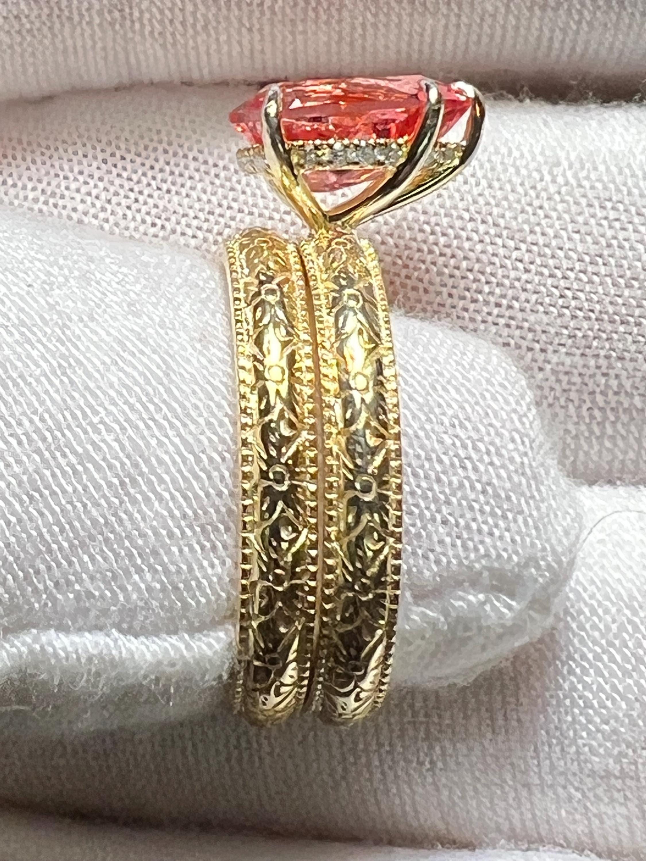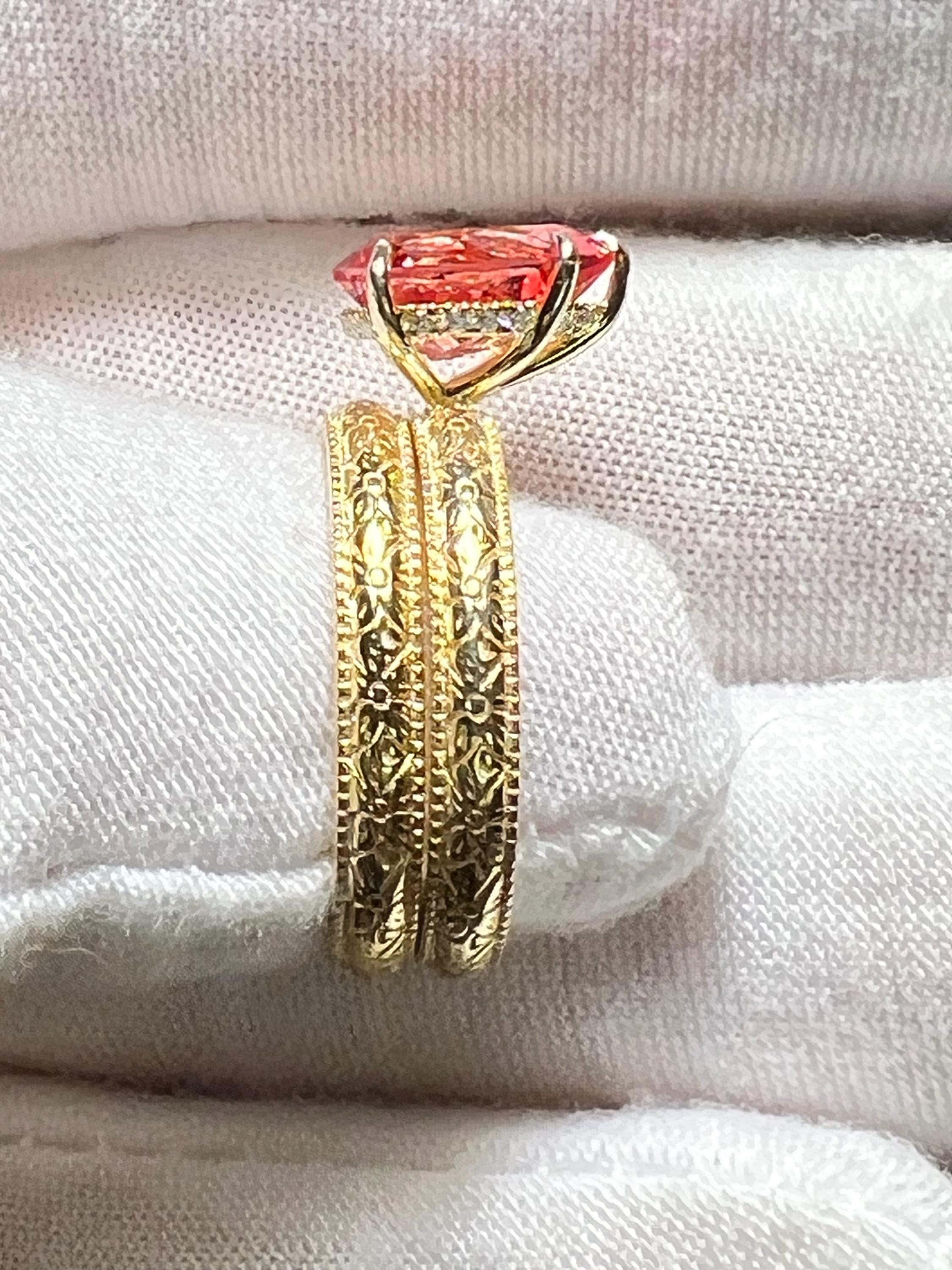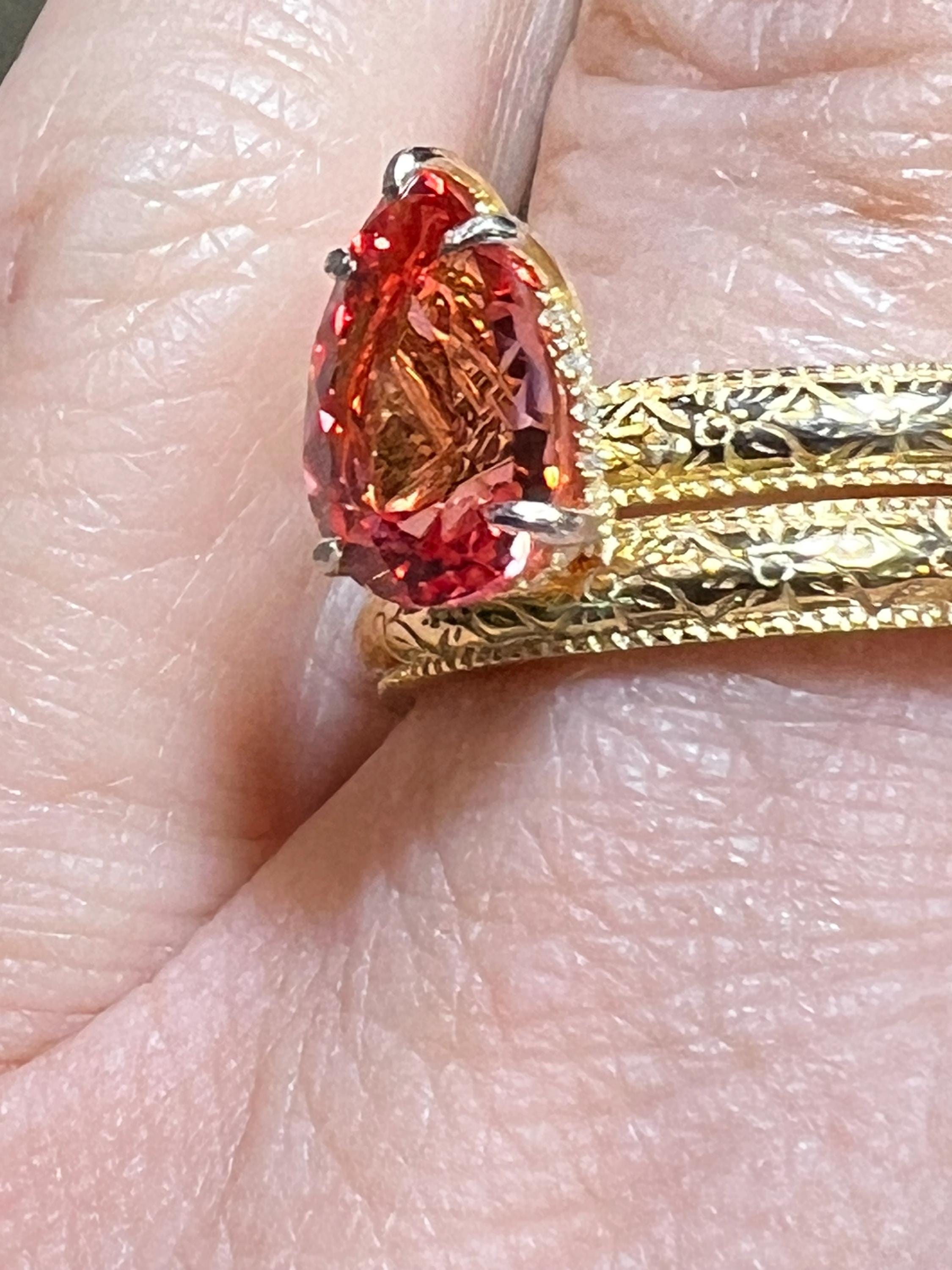 14K Yellow Gold Plated Certified 2.57CT Pear Lab Grown Pink Padparadscha Sapphire Hidden Halo French Toile Milgrain Bands Size 7 (Art Deco)