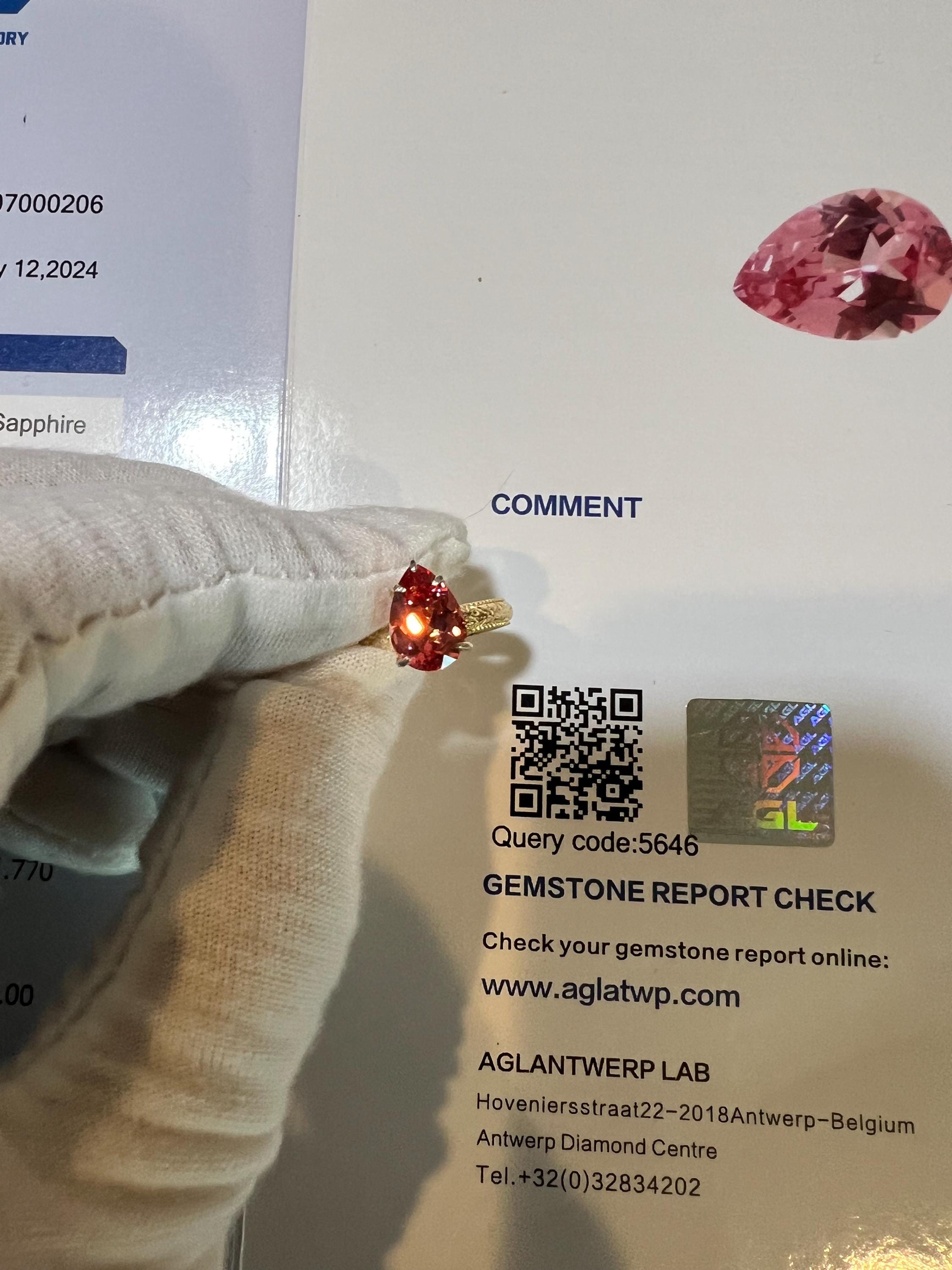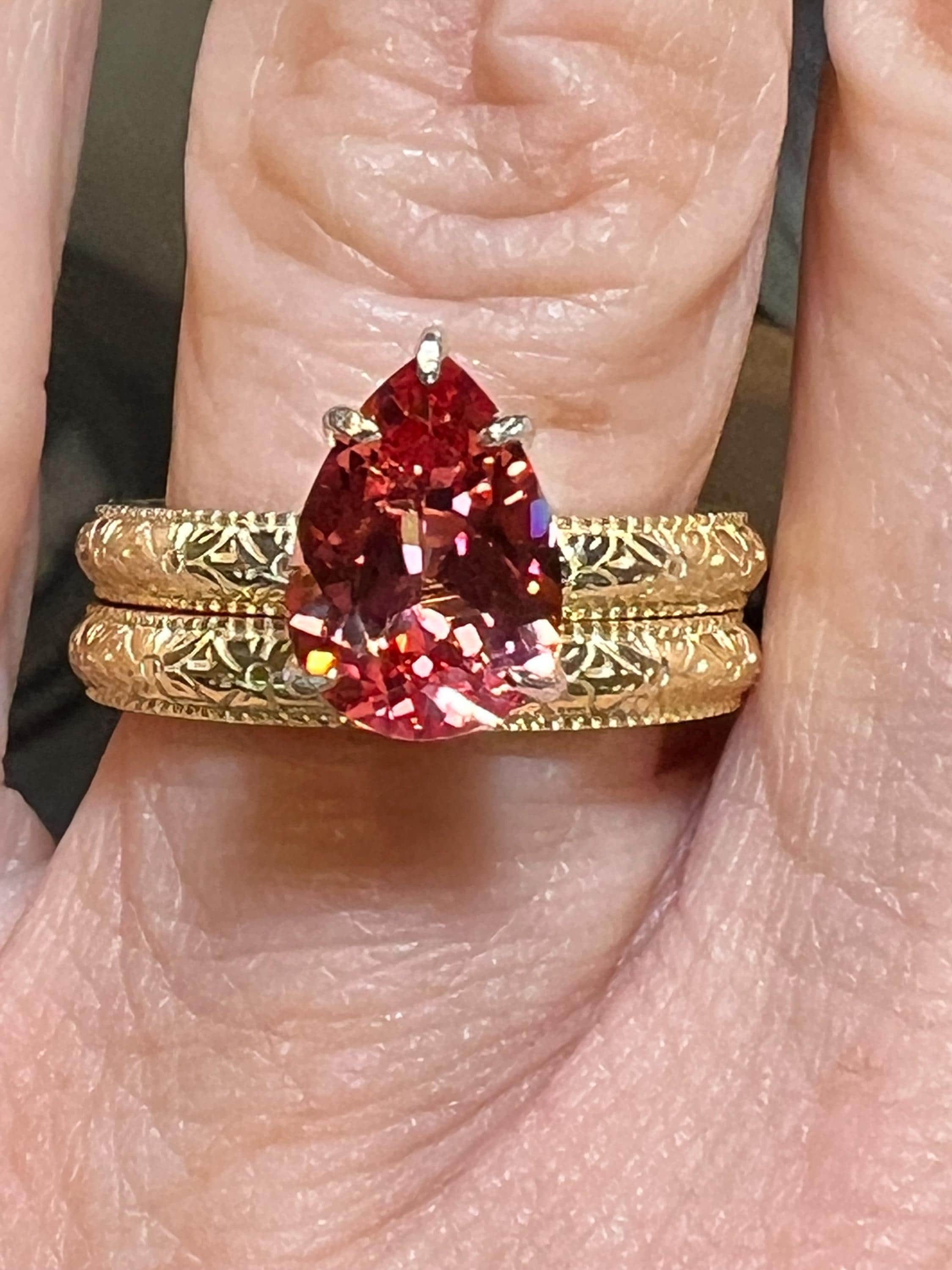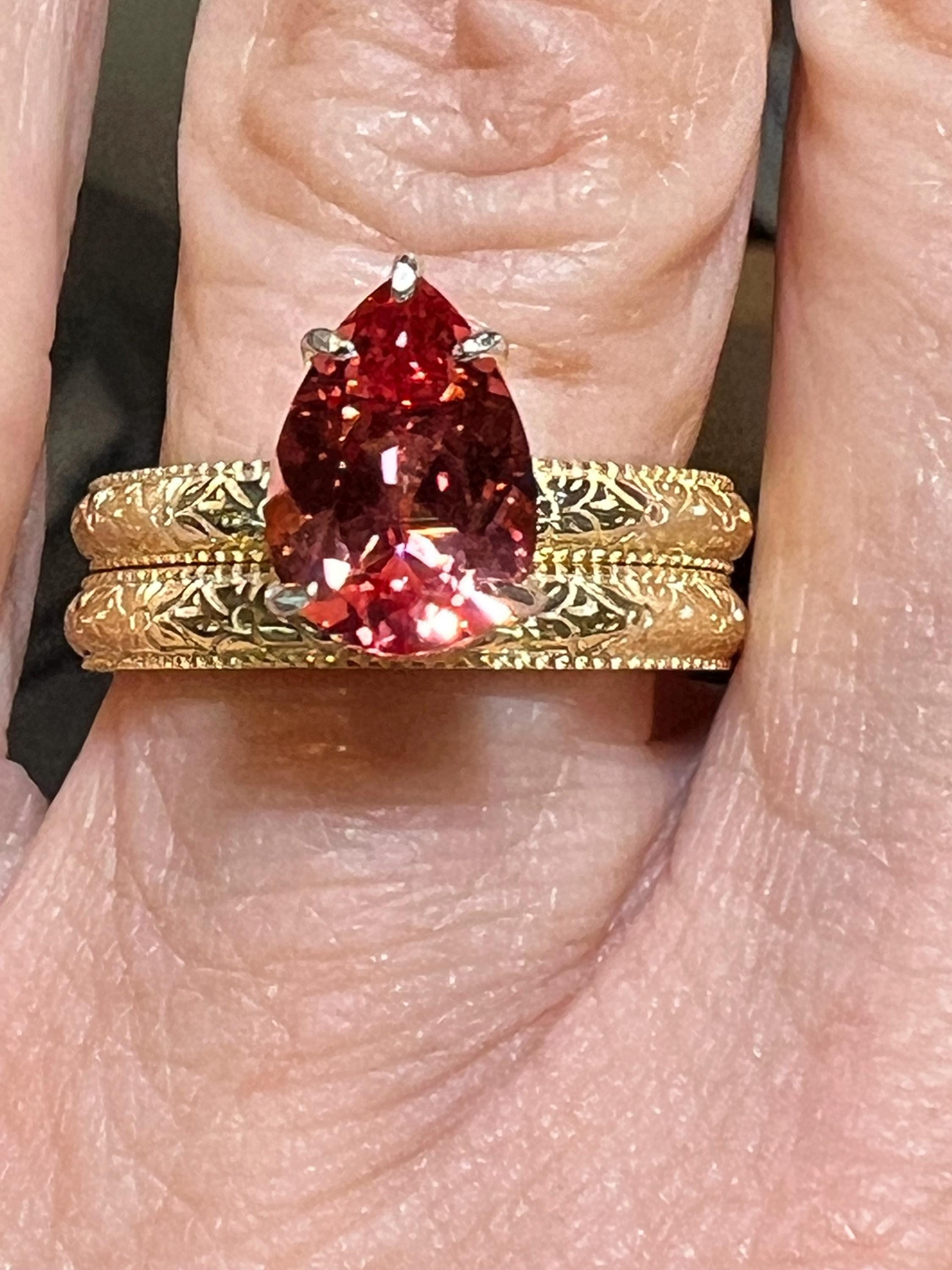 14K Yellow Gold Plated Certified 2.57CT Pear Lab Grown Pink Padparadscha Sapphire Hidden Halo French Toile Milgrain Bands Size 7 (Art Deco)