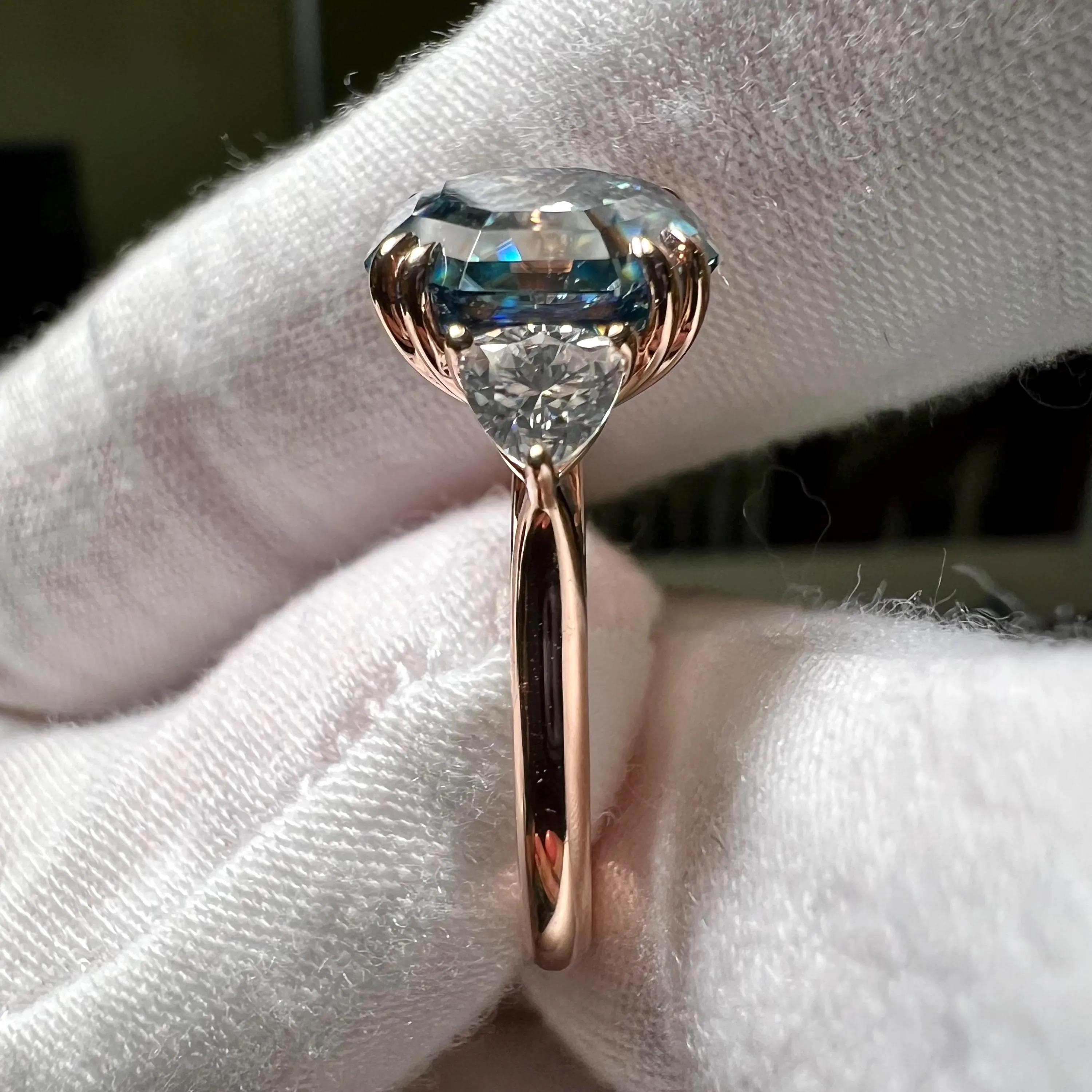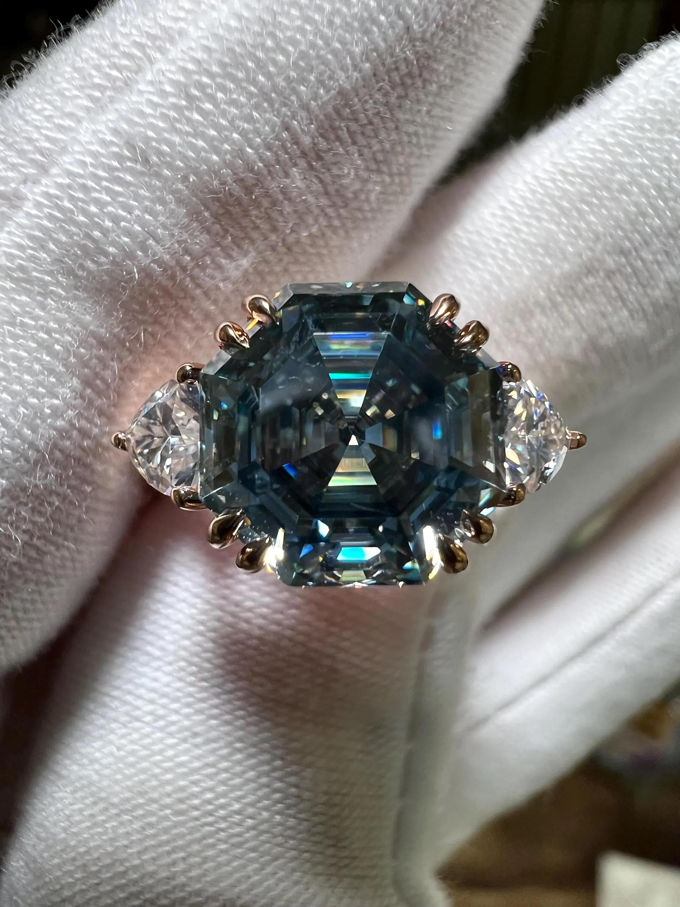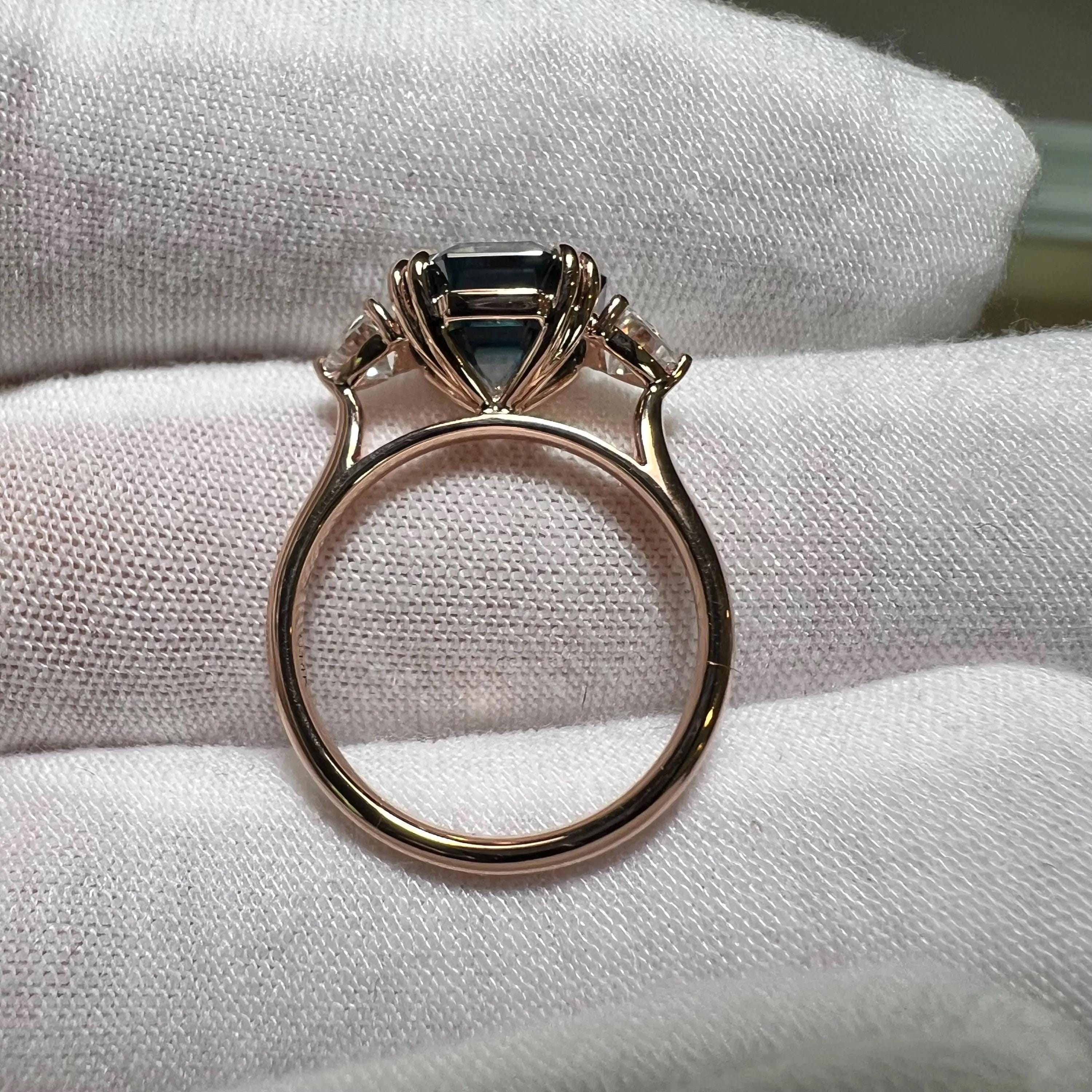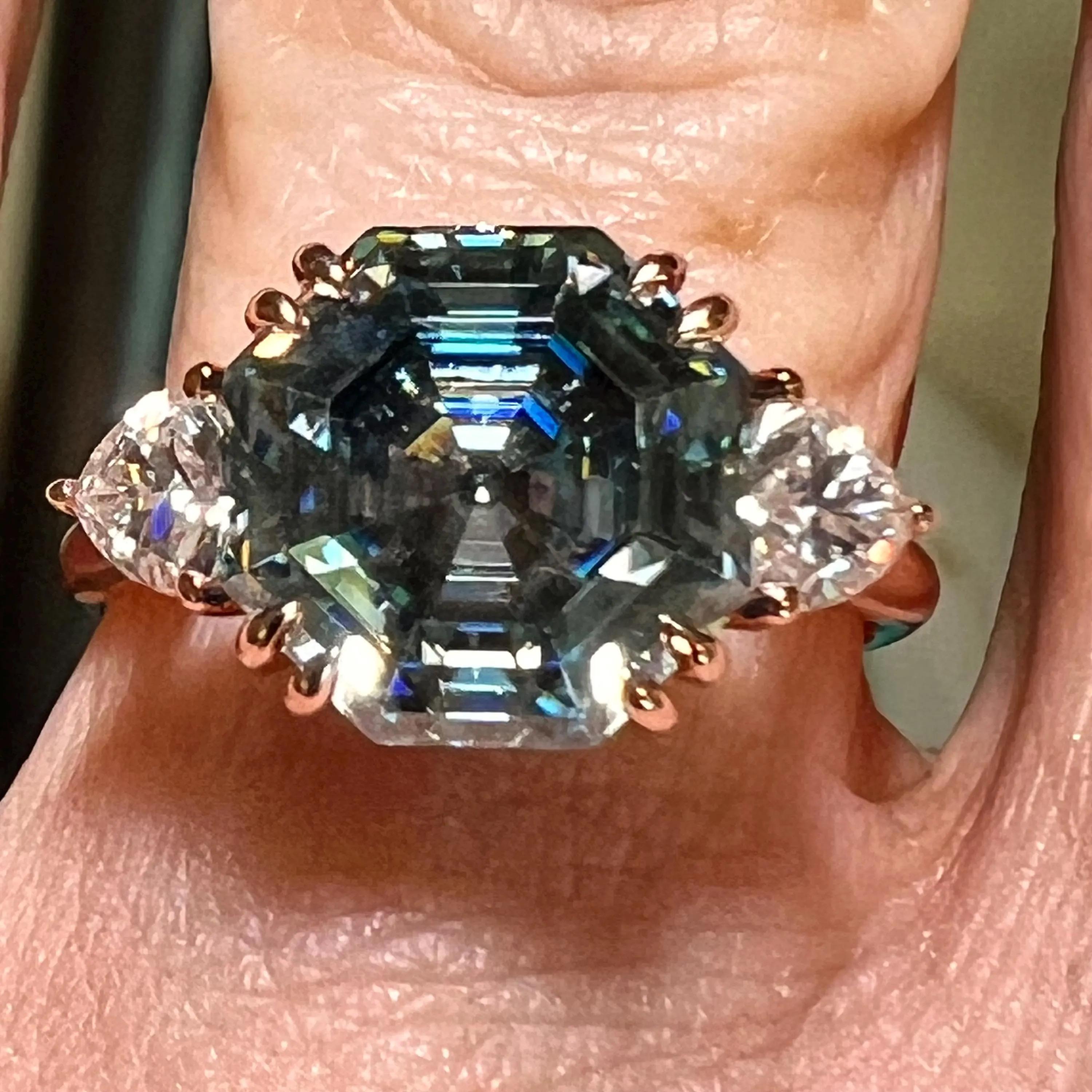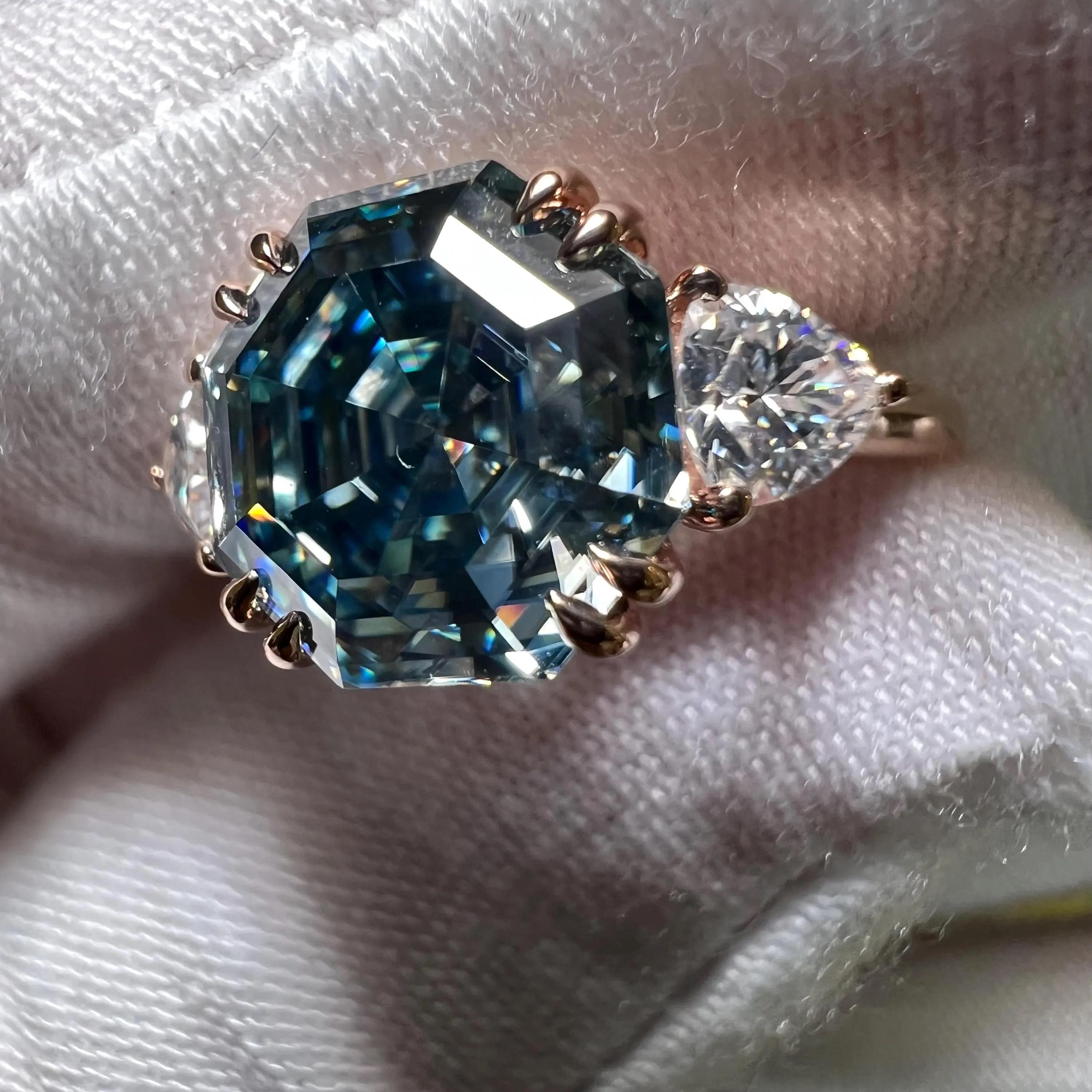 A rare Hexagonal 3.01ct Fancy Intense Green Blue VVS2 EX EX prong set in 14K rose gold with lab grow diamond accents.