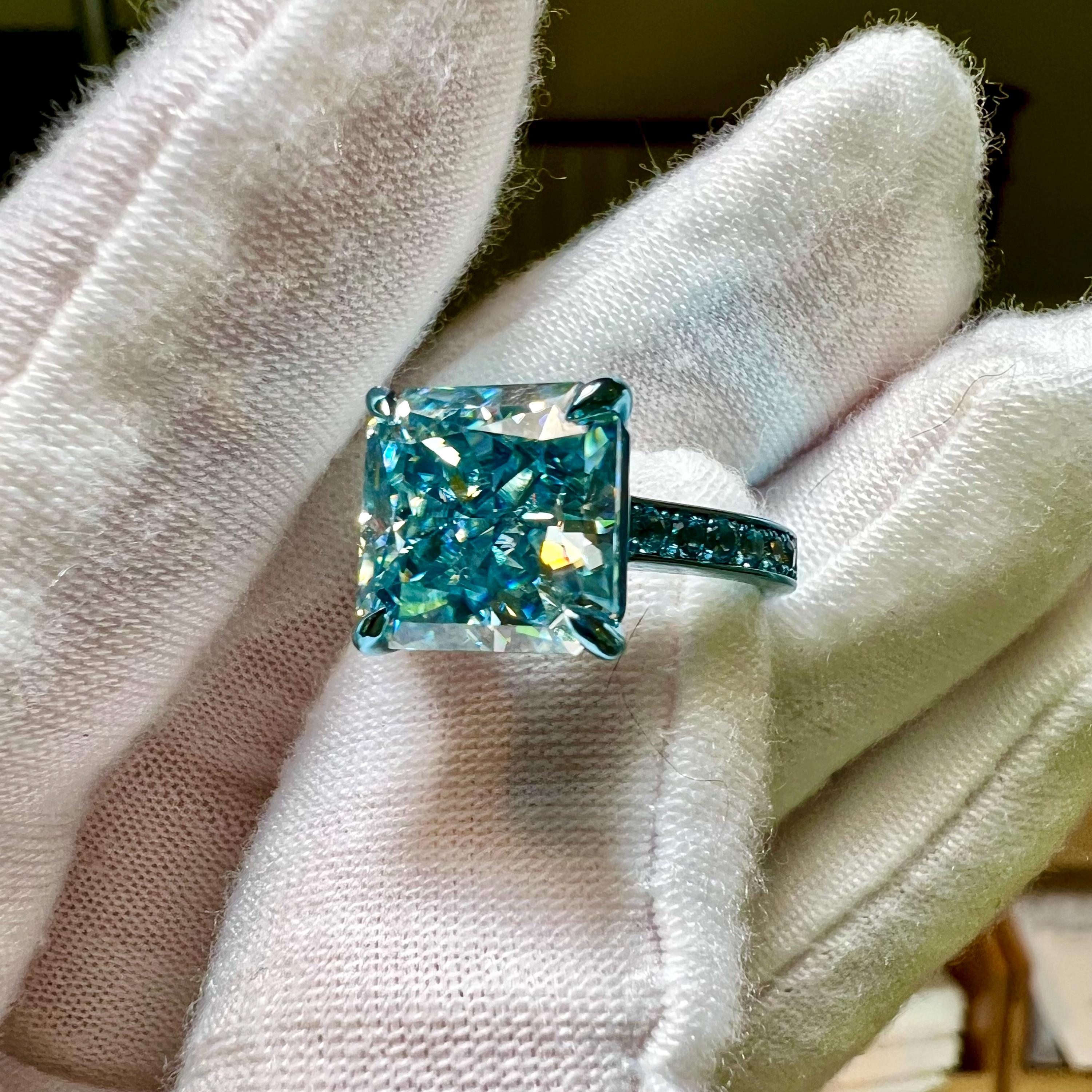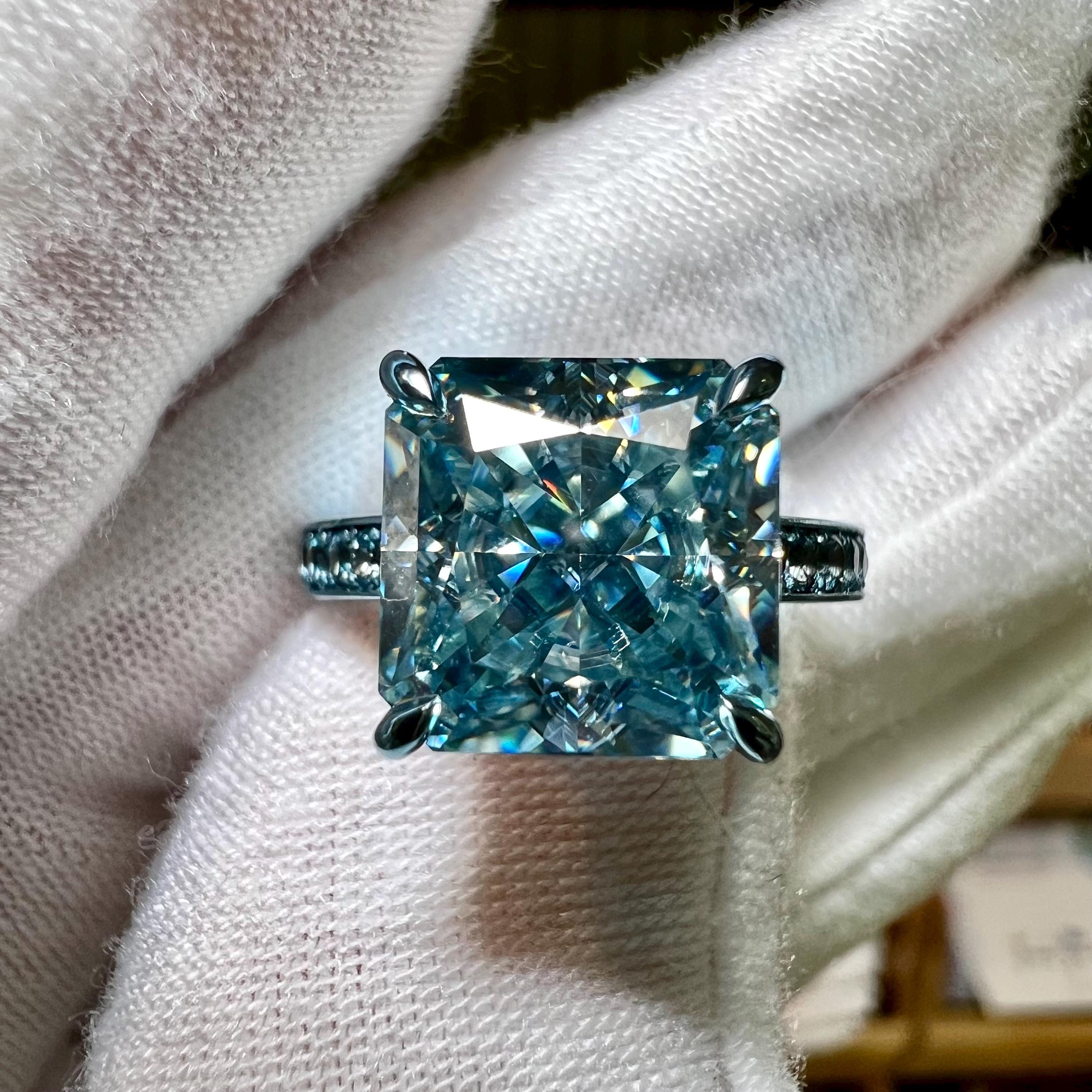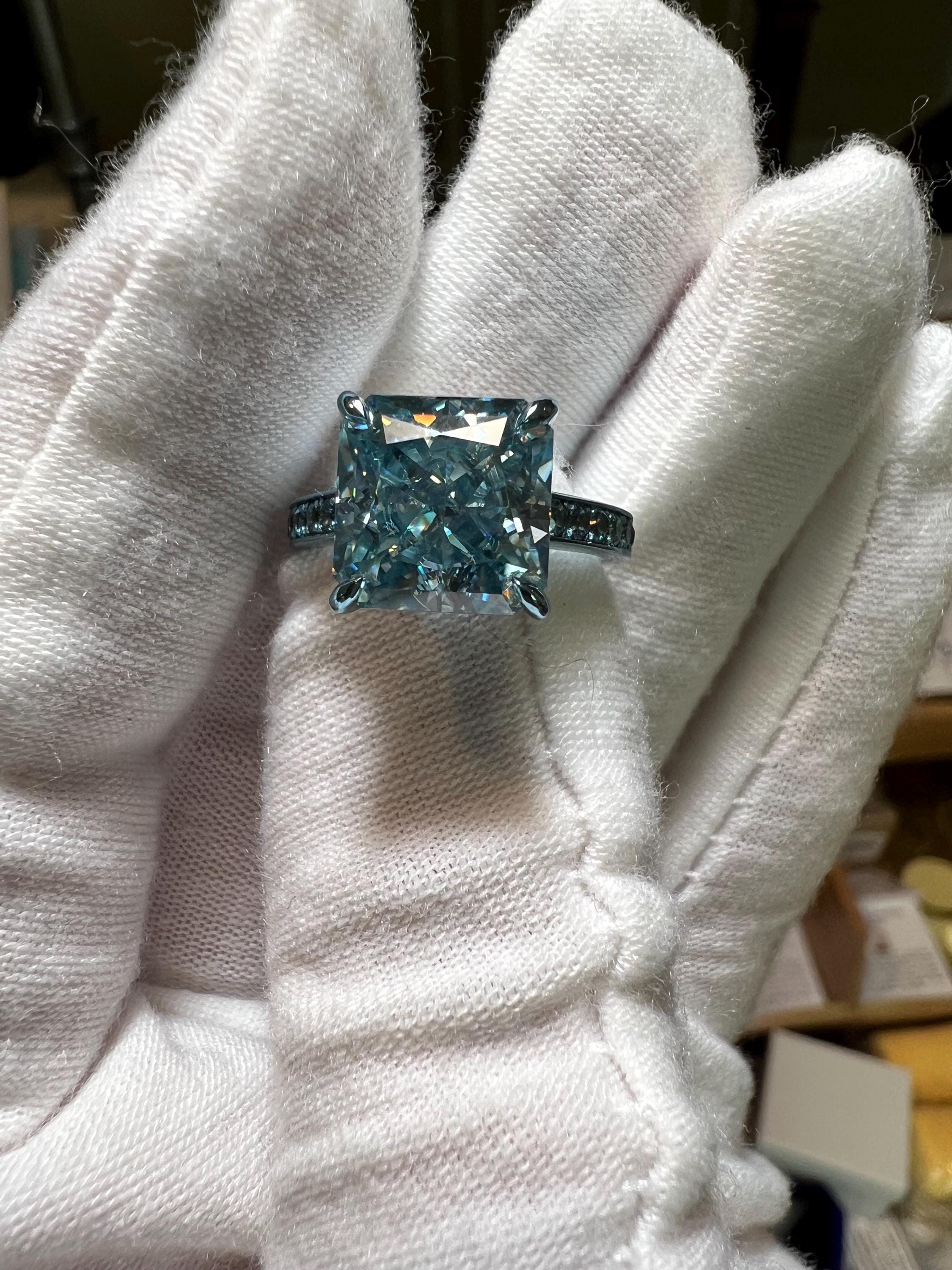 10K Dusty Blue Gold 3.5CT Square Radiant Fancy Vivid Blue VVS2 Lab Grown Diamond Engagement Ring