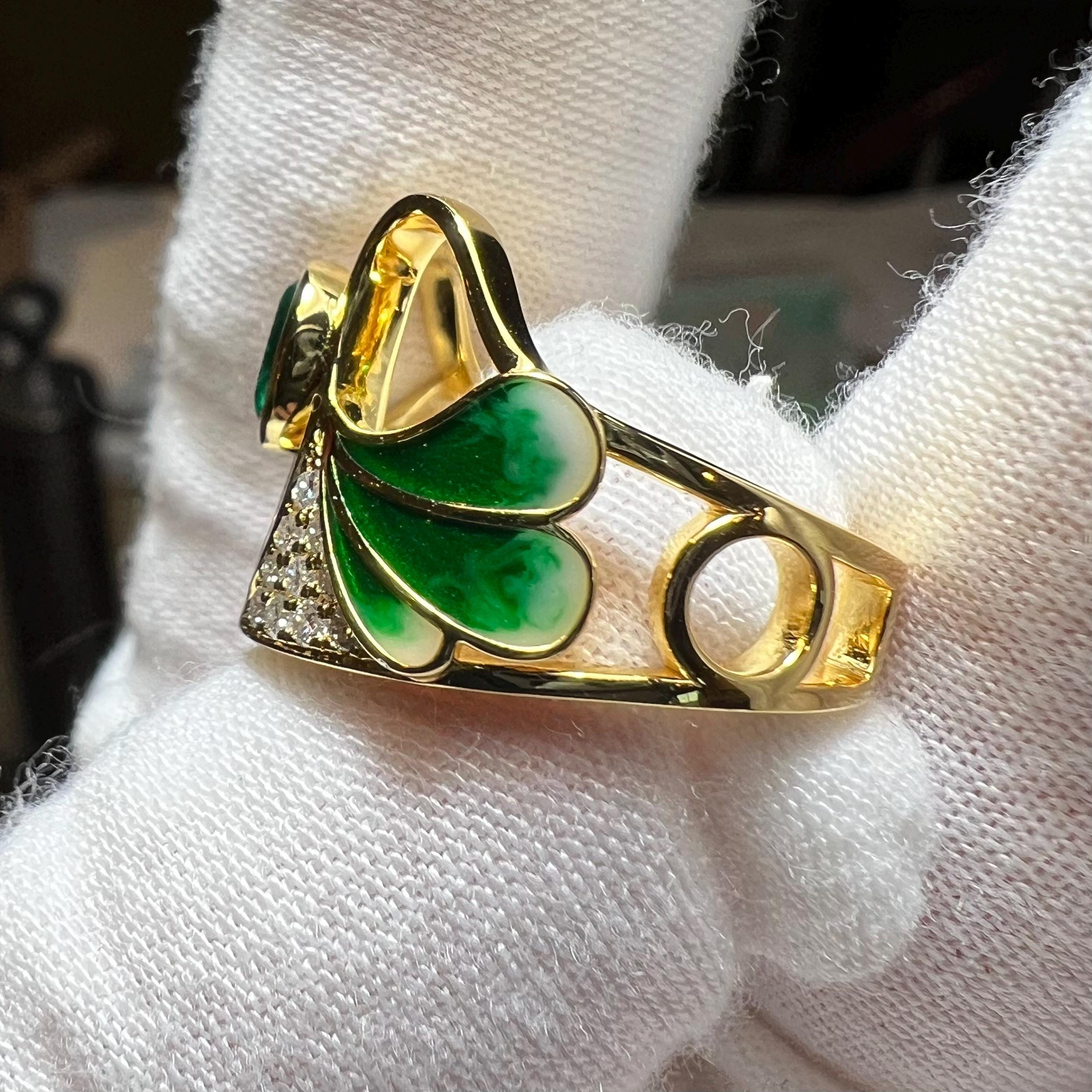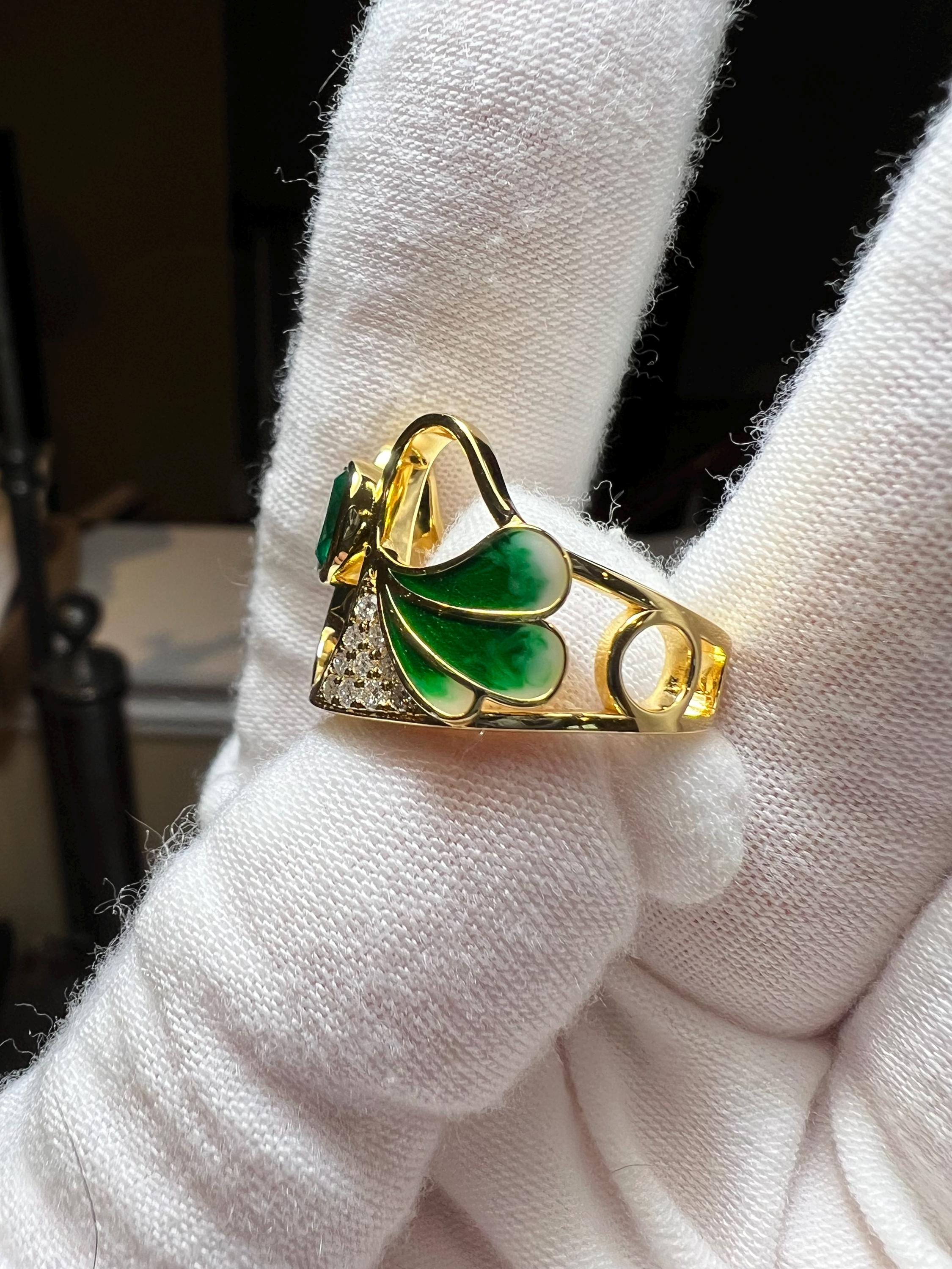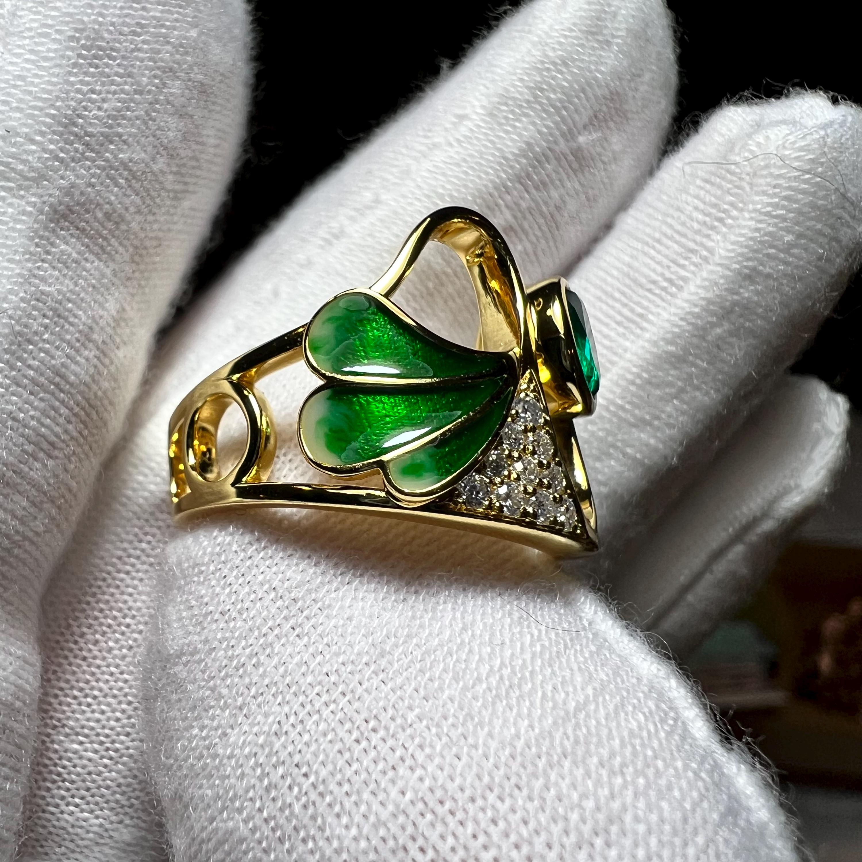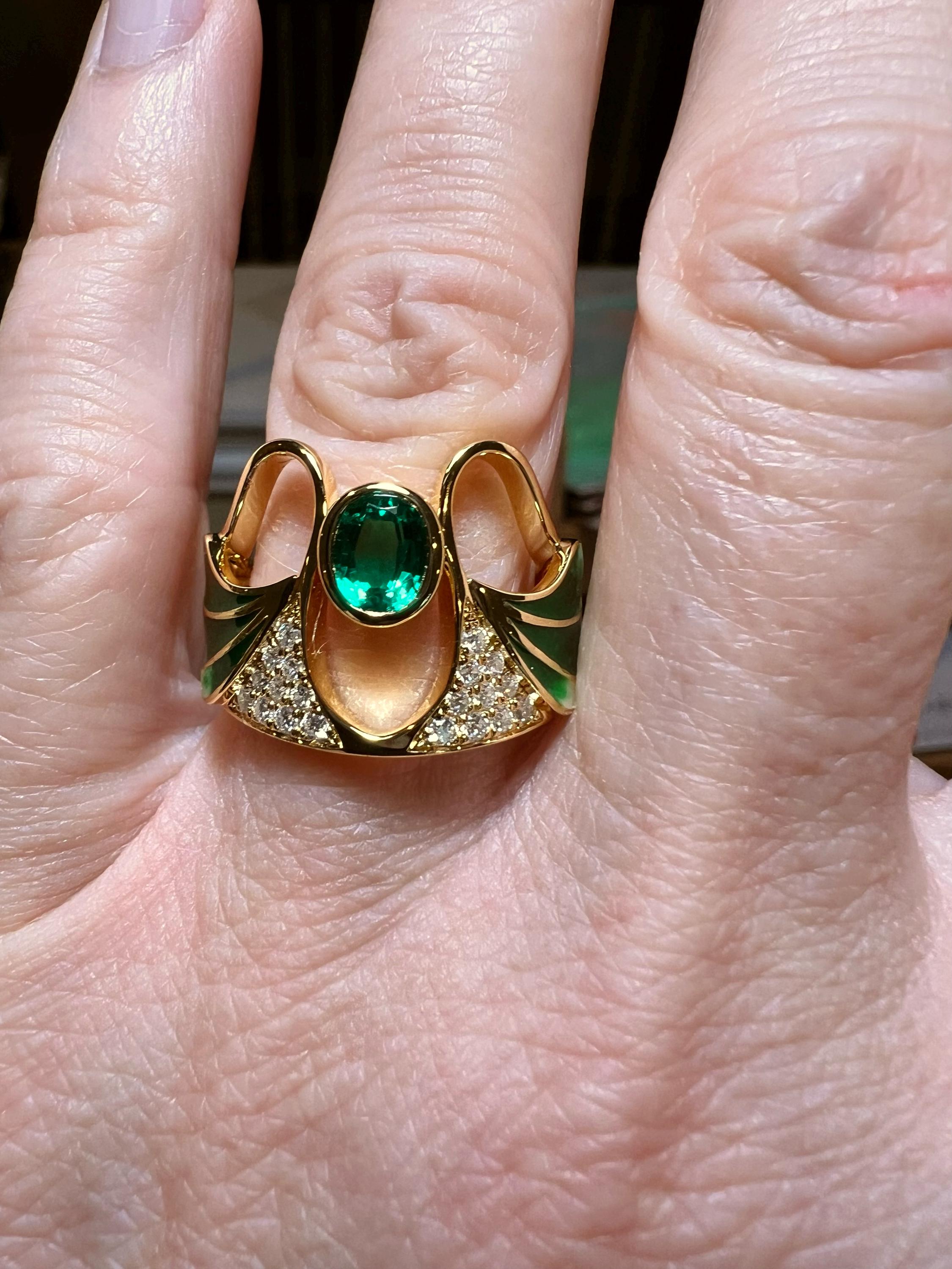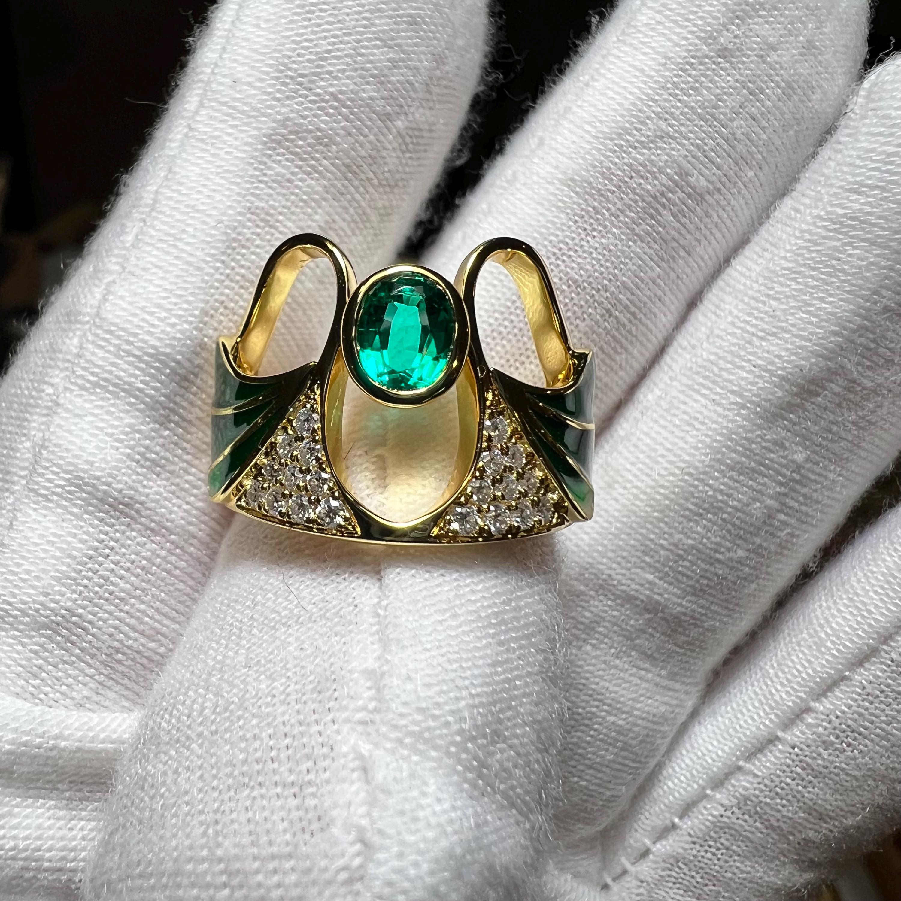 Art Deco 14K Yellow Gold 1CT Oval Lab Grown Emerald Painted Art Nouveau Ring