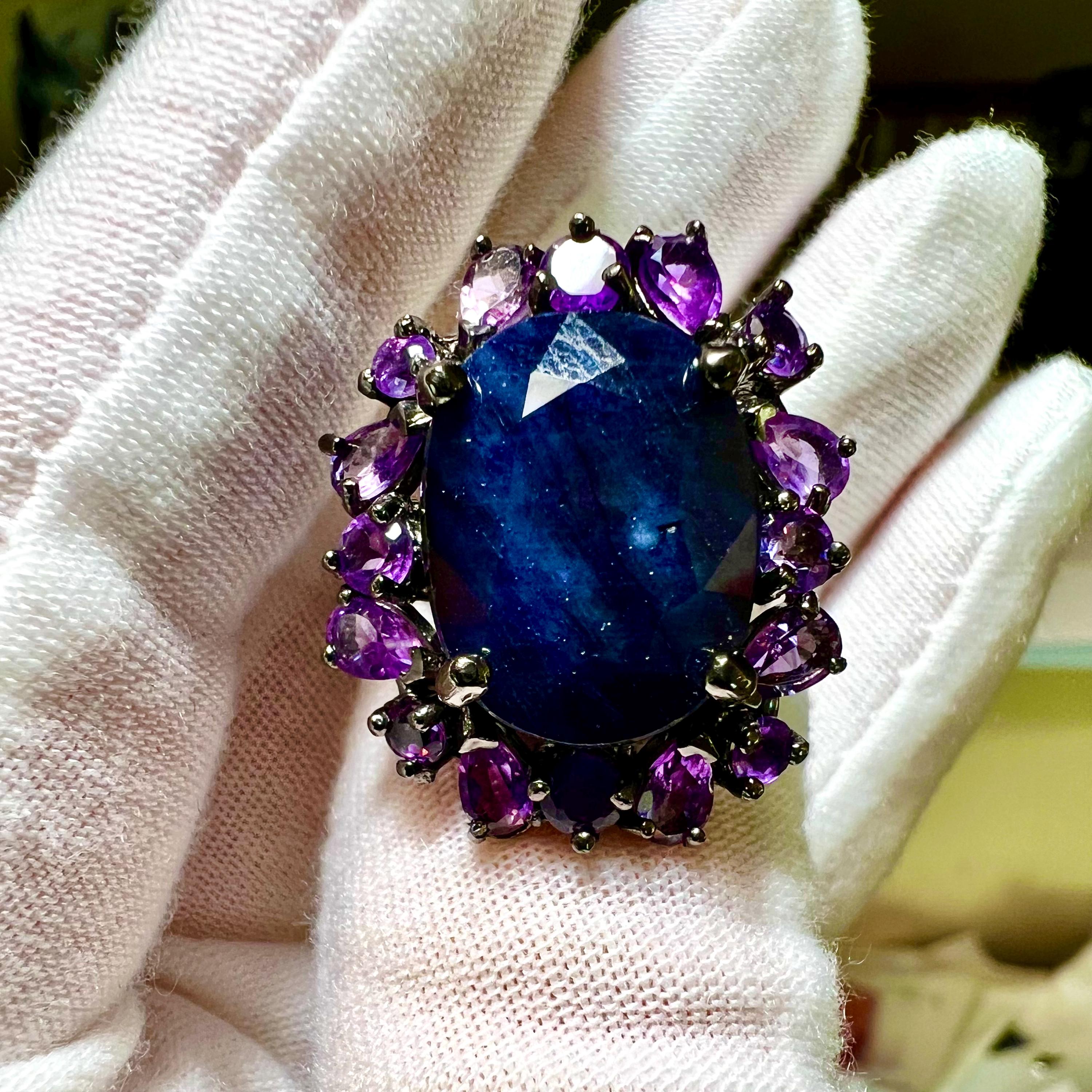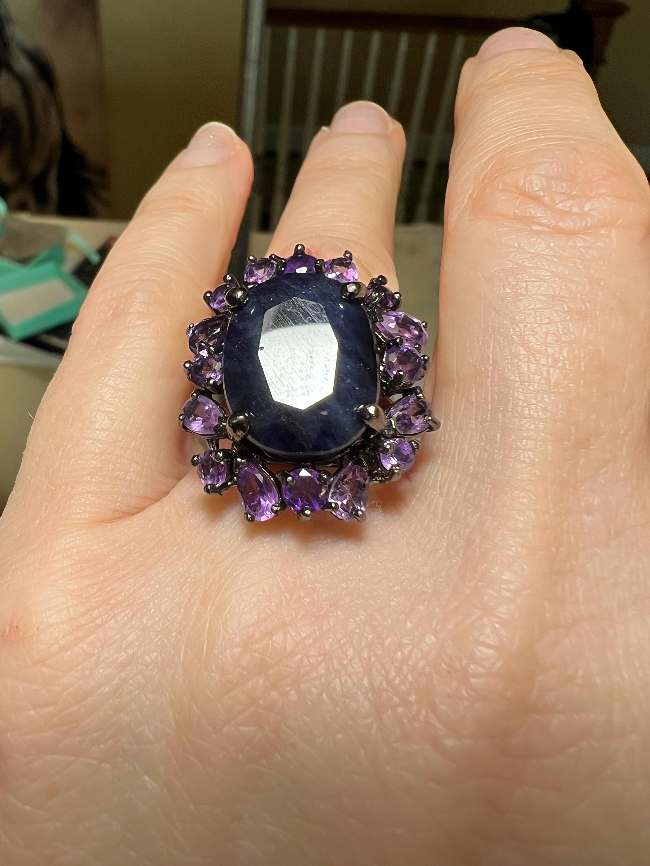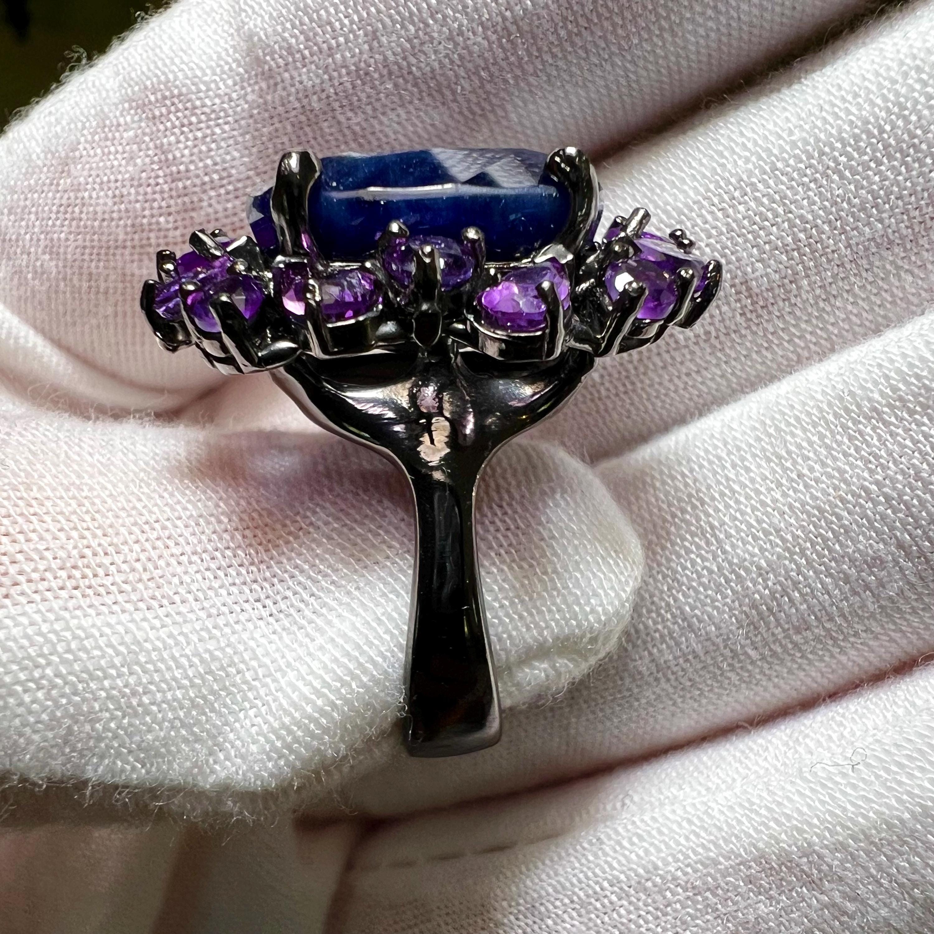Natural 8.8CT Oval Blue Sapphire & Purple Amethyst Halo Black Rhodium Ring Size 8.25