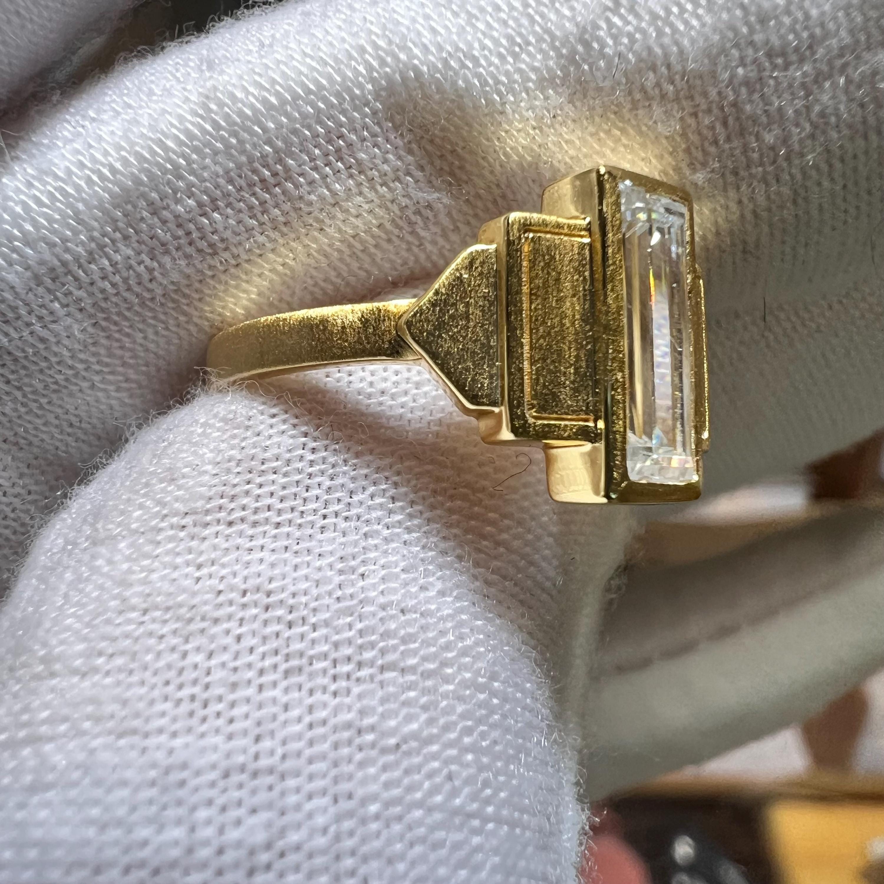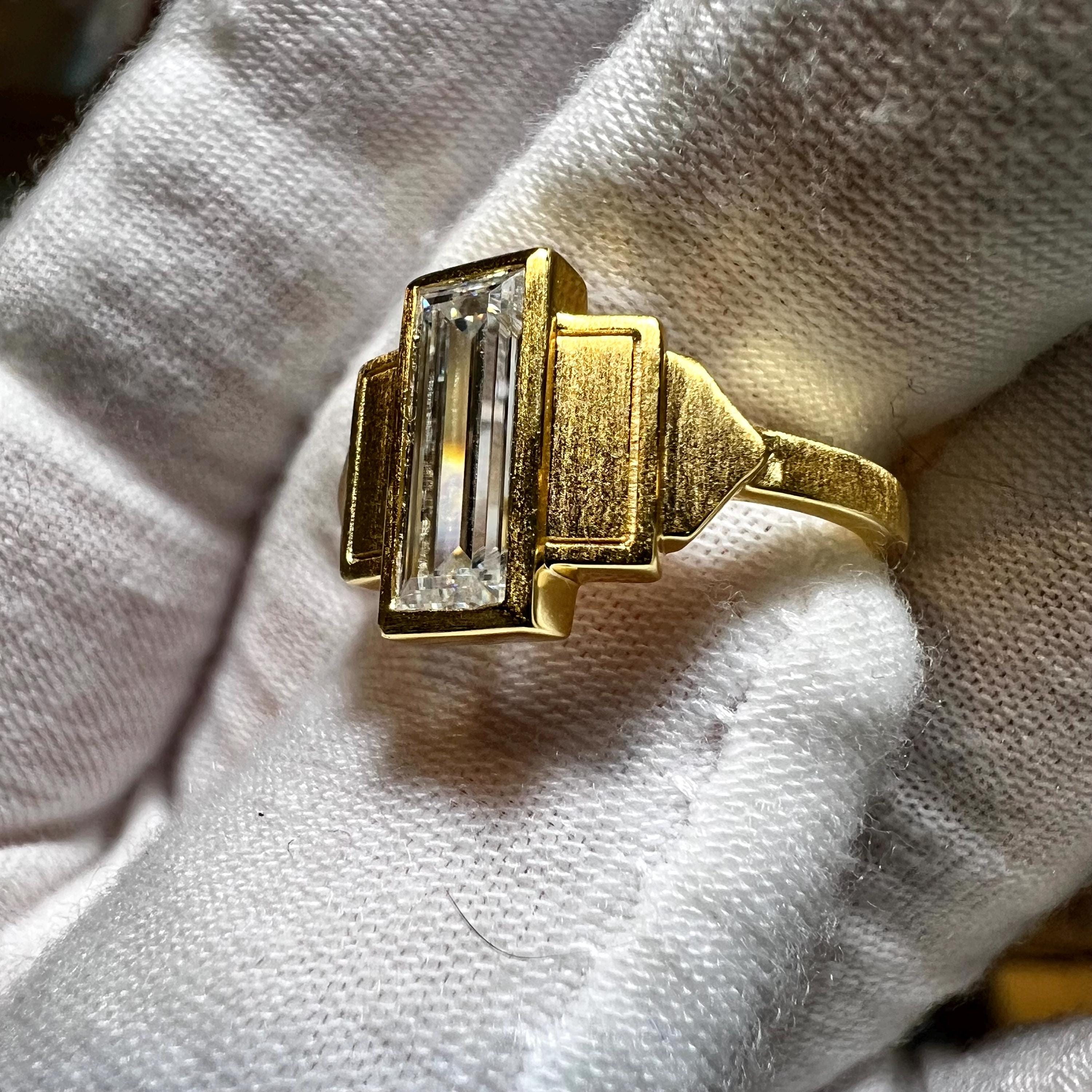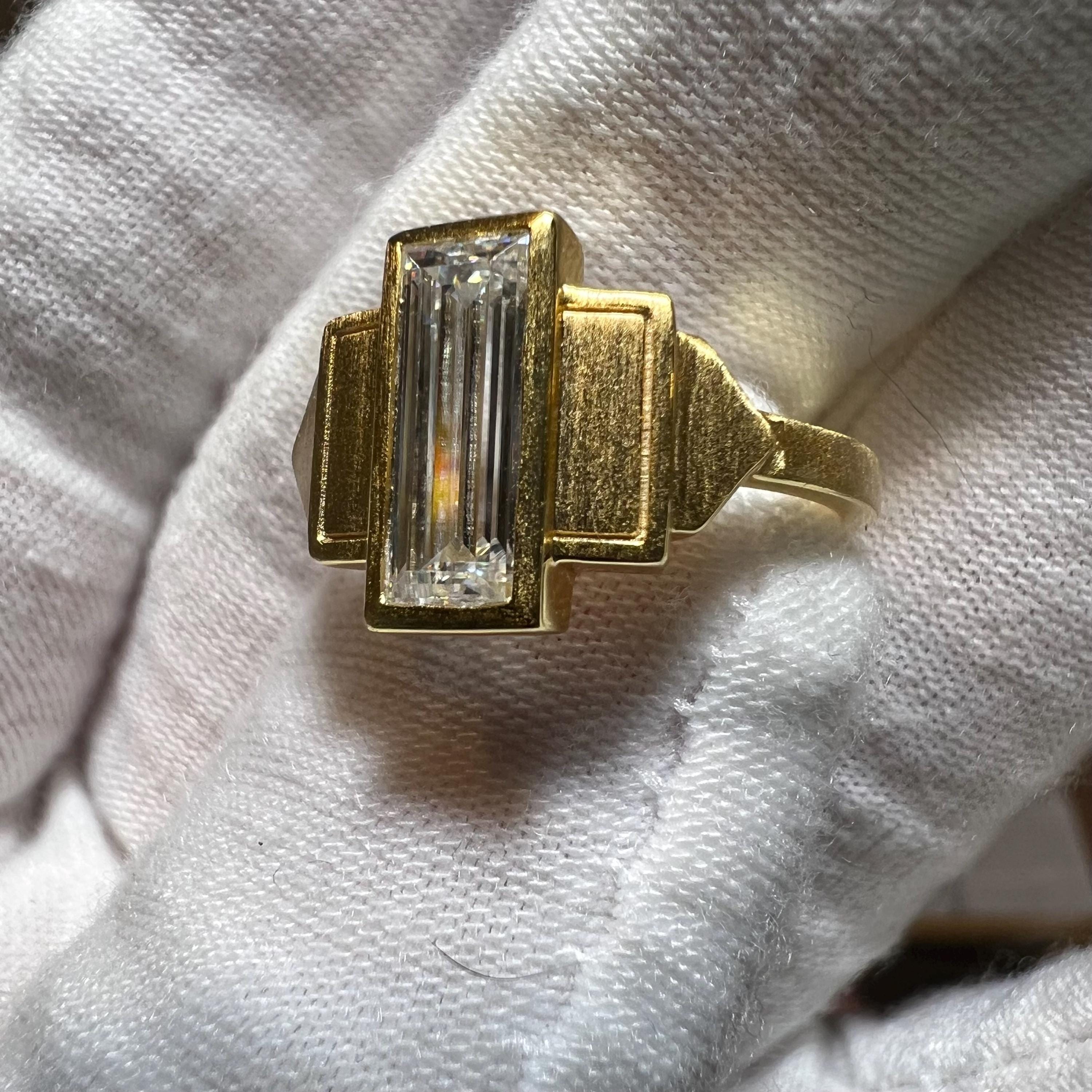 14K Brushed Gold 2.5CT G VS1 2EX Baguette Lab Grown Diamond Bezel Set Art deco Engagement Ring