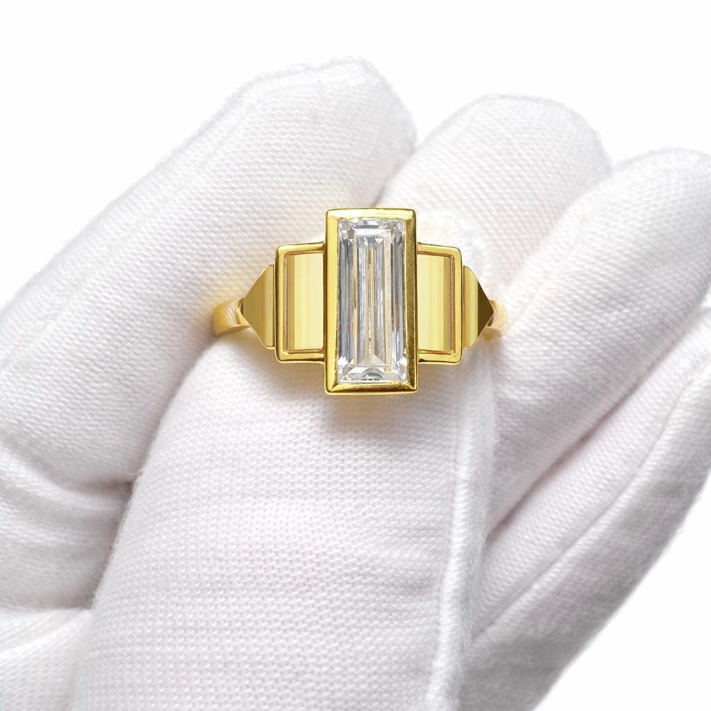 14K Brushed Satin Gold 2.5CT G VS1 2EX Baguette Lab Grown Diamond Bezel Set Art Deco Engagement Ring