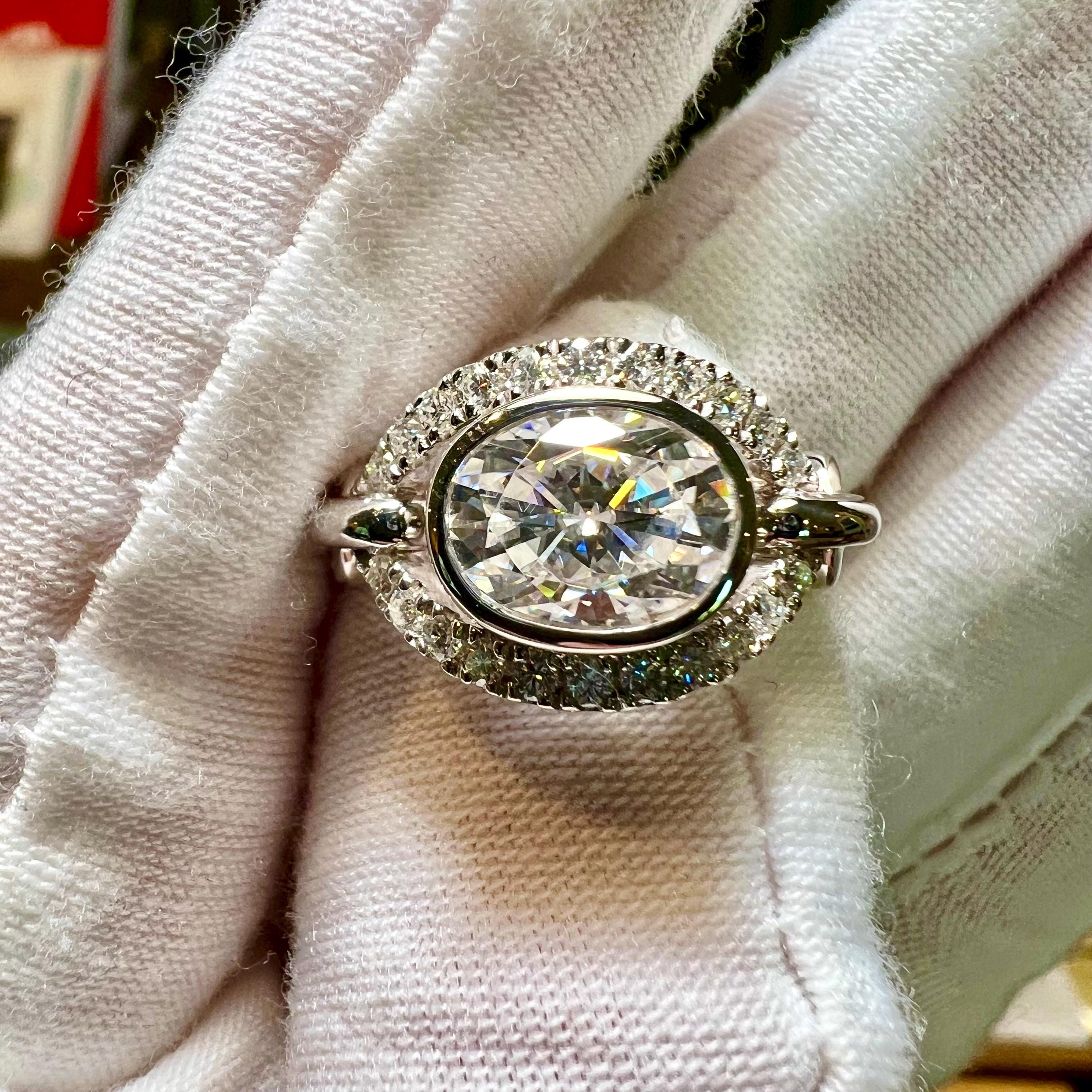 10K 14K Gold 2CT Oval G VVS2 2EX Lab Grown Diamond East West Bezel Buckle Engagement Ring