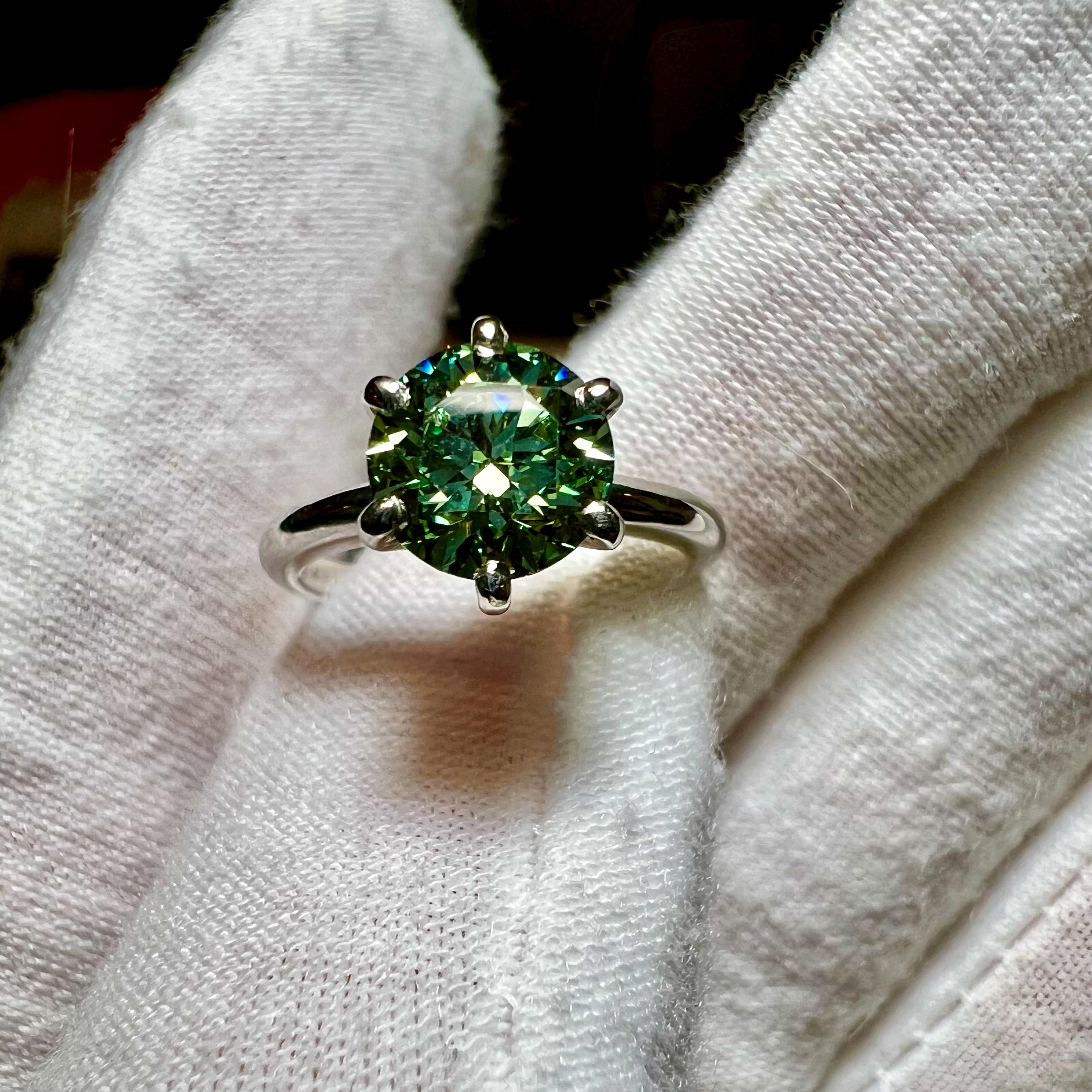 Certified 1.5CT Round Brilliant Cut Fancy Vivid Green VVS2 ID 2EX Lab Grown Diamond Engagement Ring
