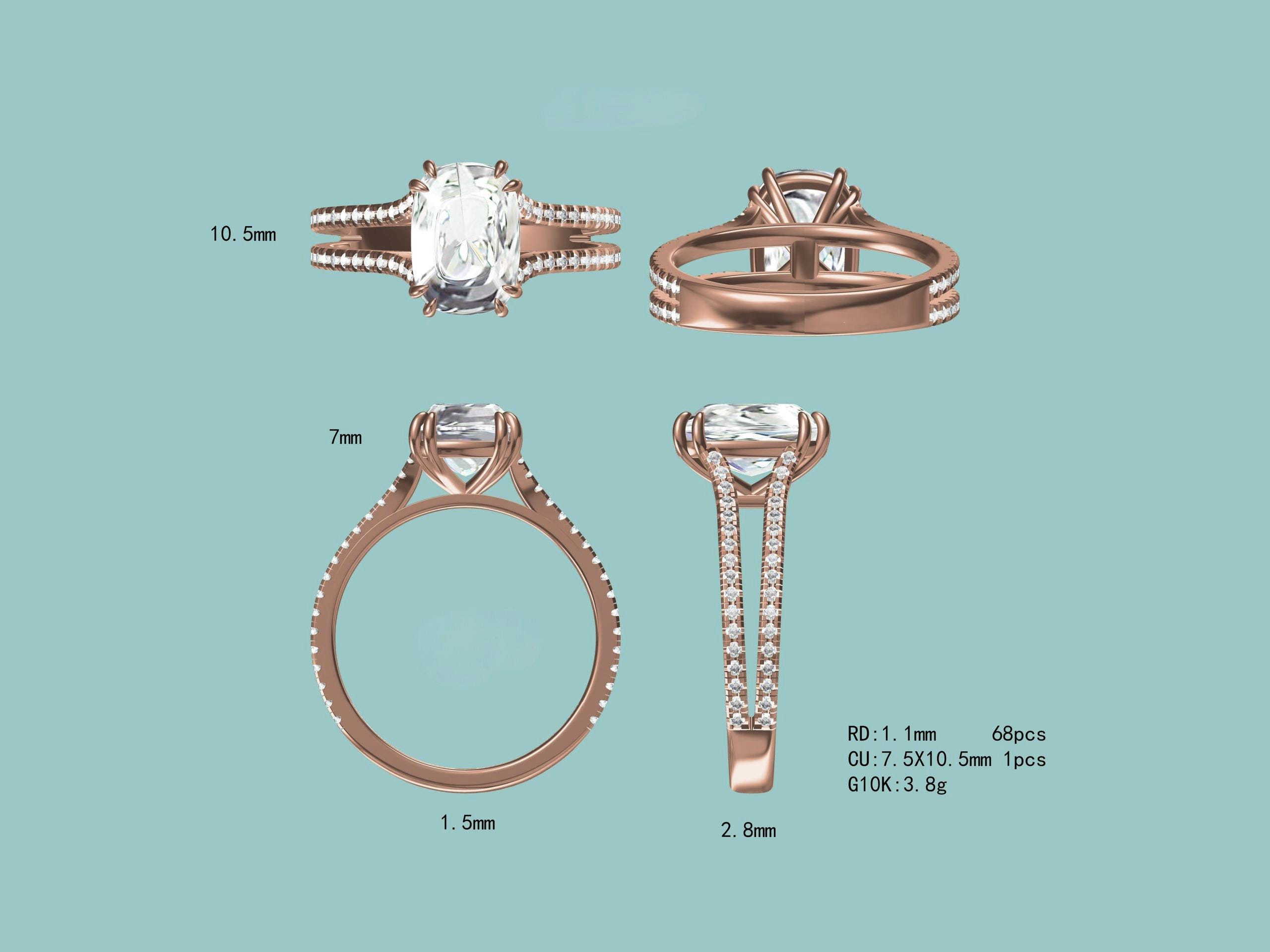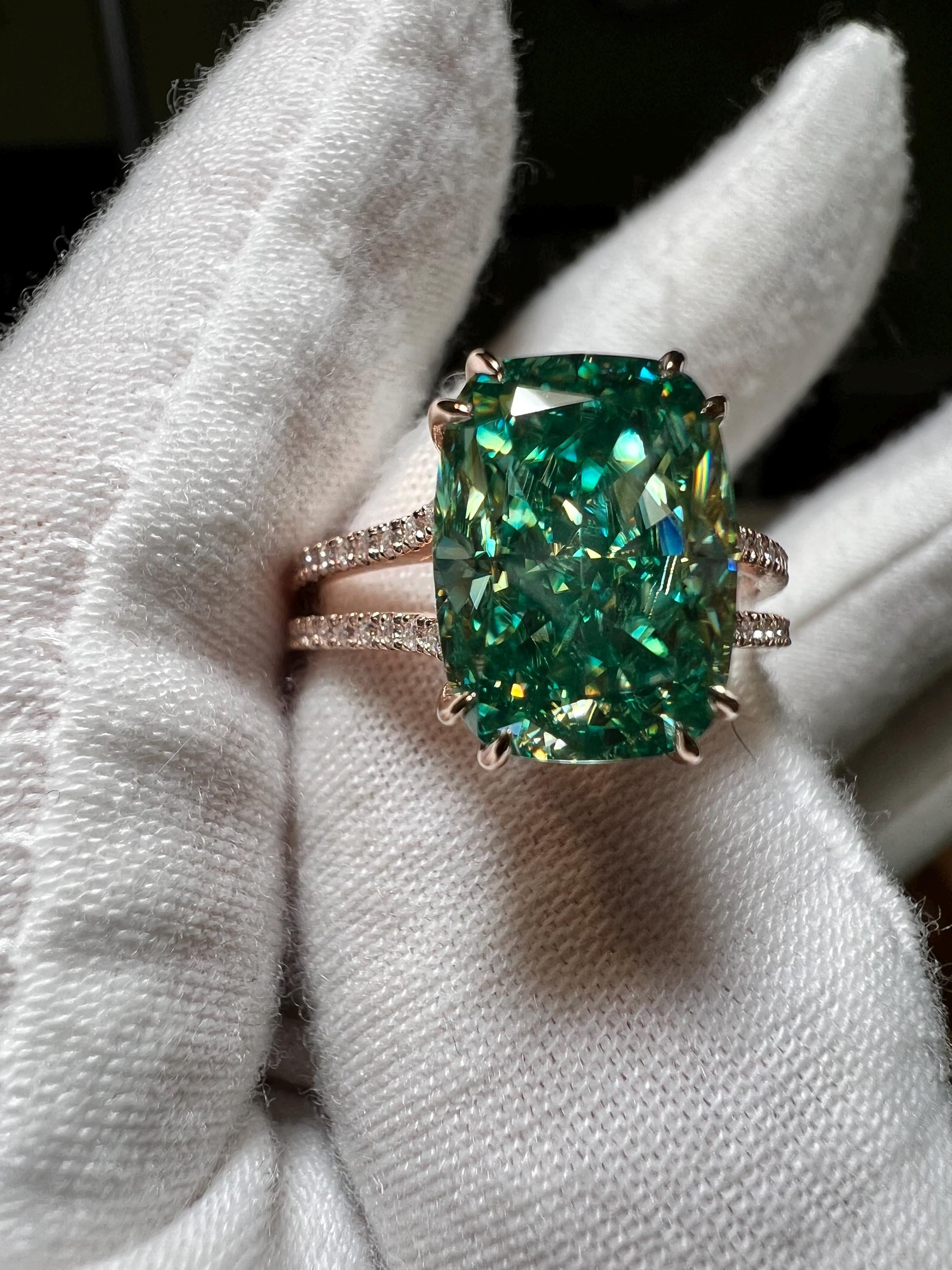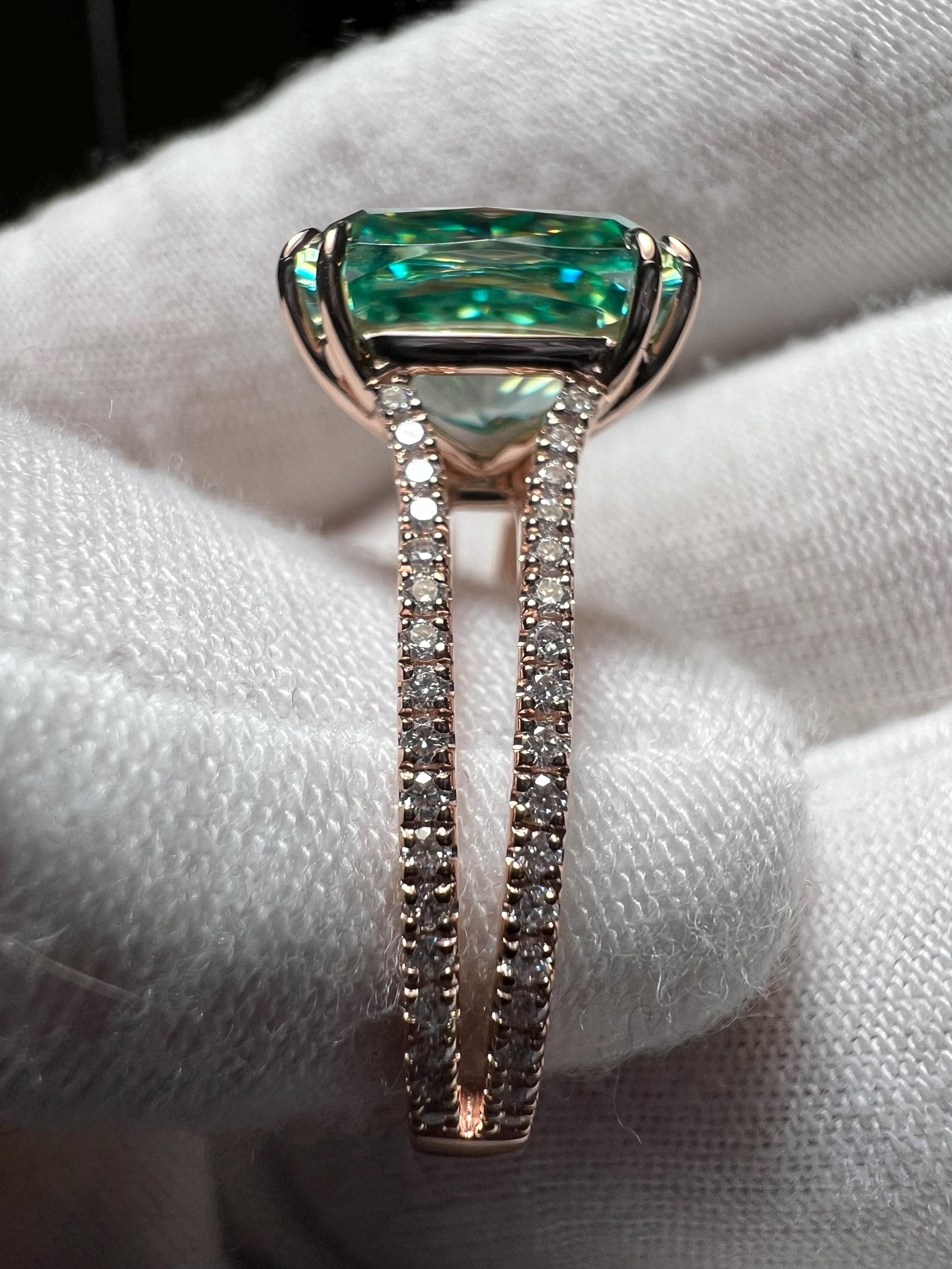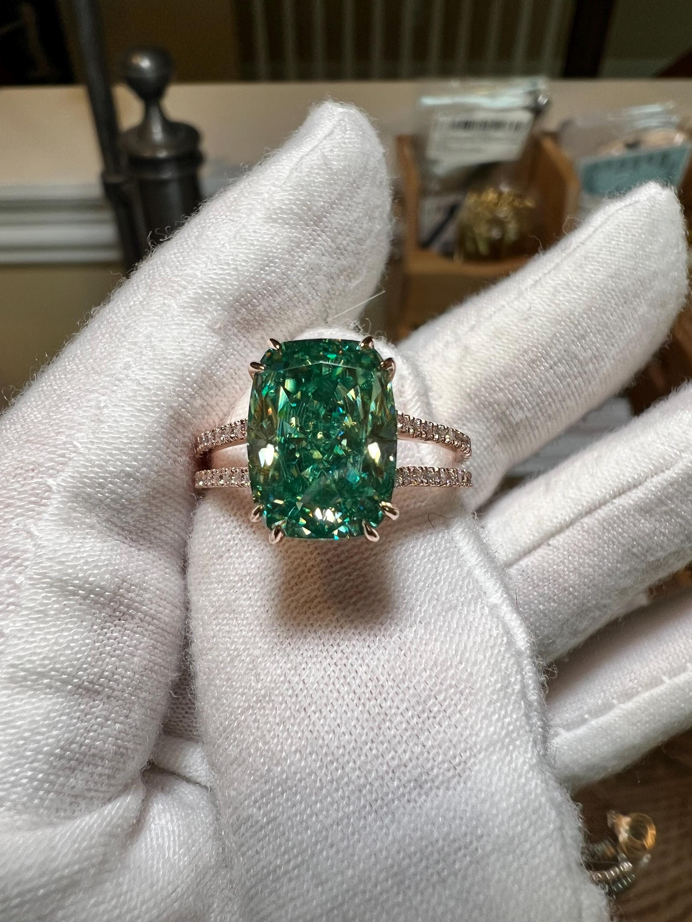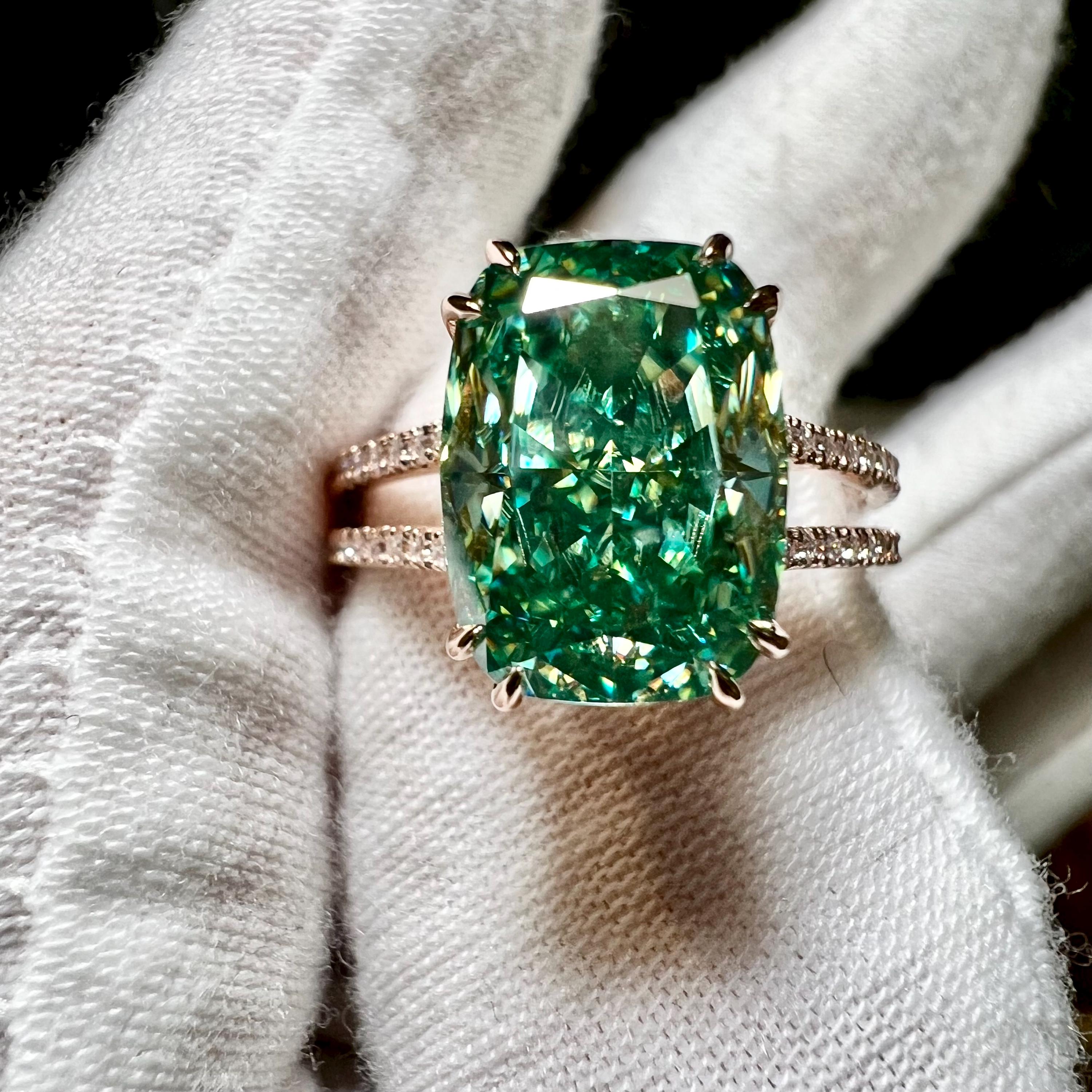 IGI 14K Gold 4.5CT Fancy Vivid Green VVS2 2EX Elongated Cushion Modified Lab Grown Diamond Engagement Ring