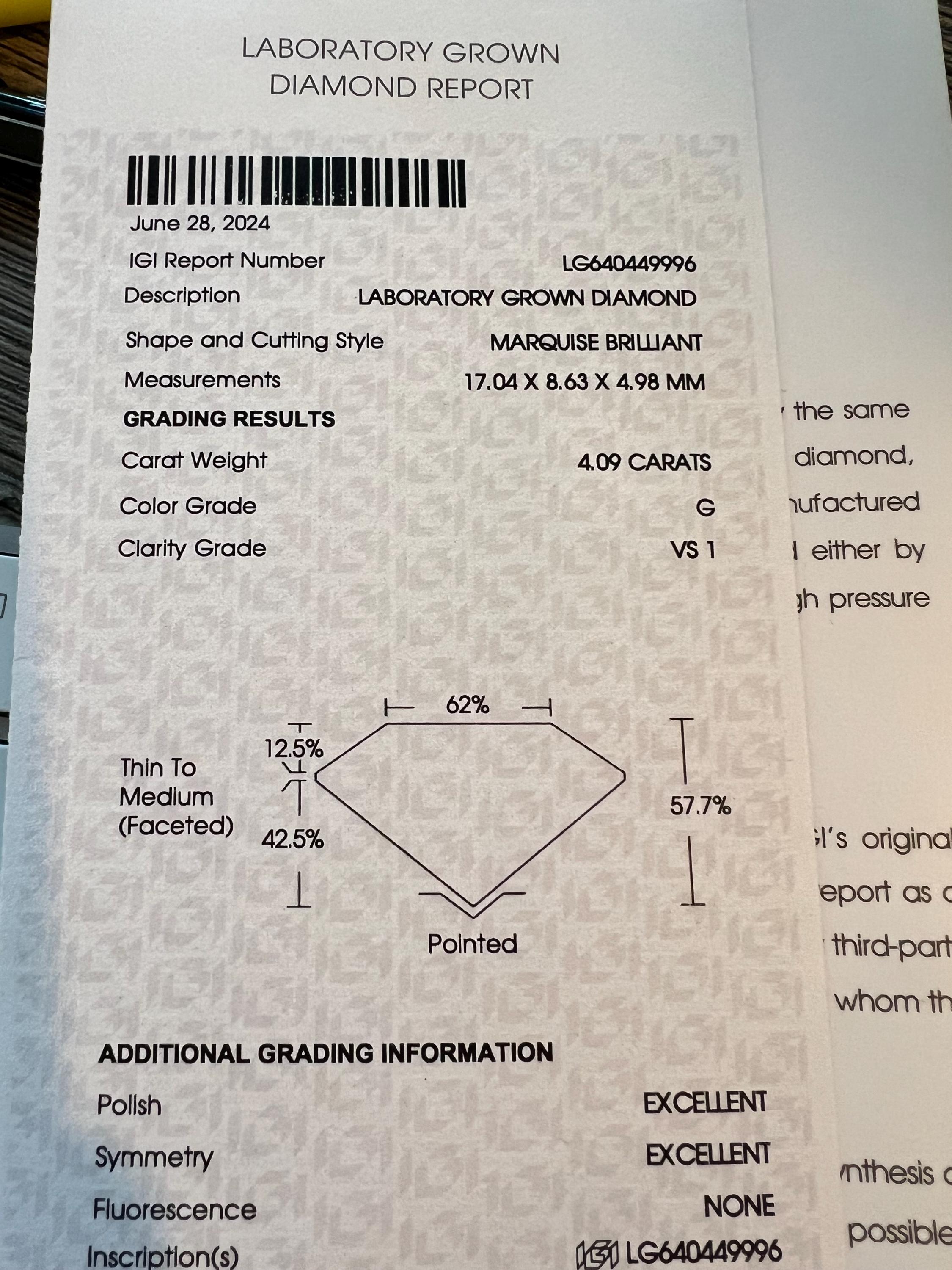 4.09CT G VS1 2EX Marquise Lab Grown Diamond