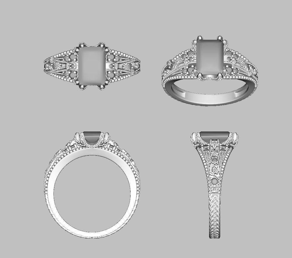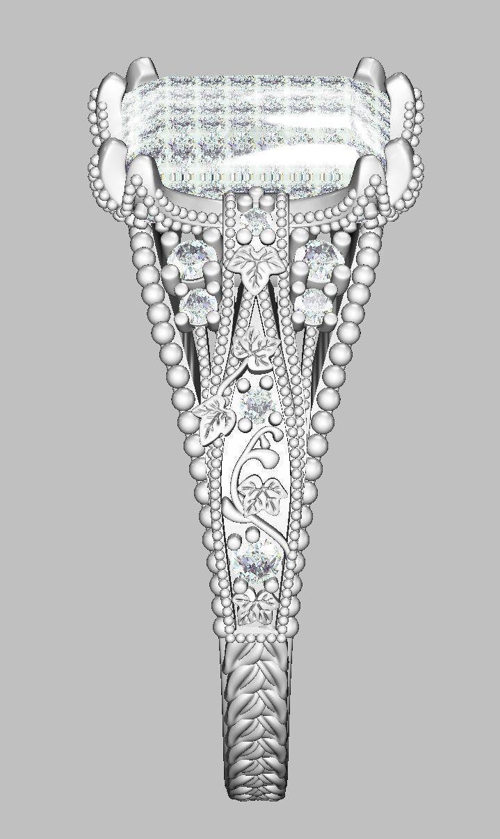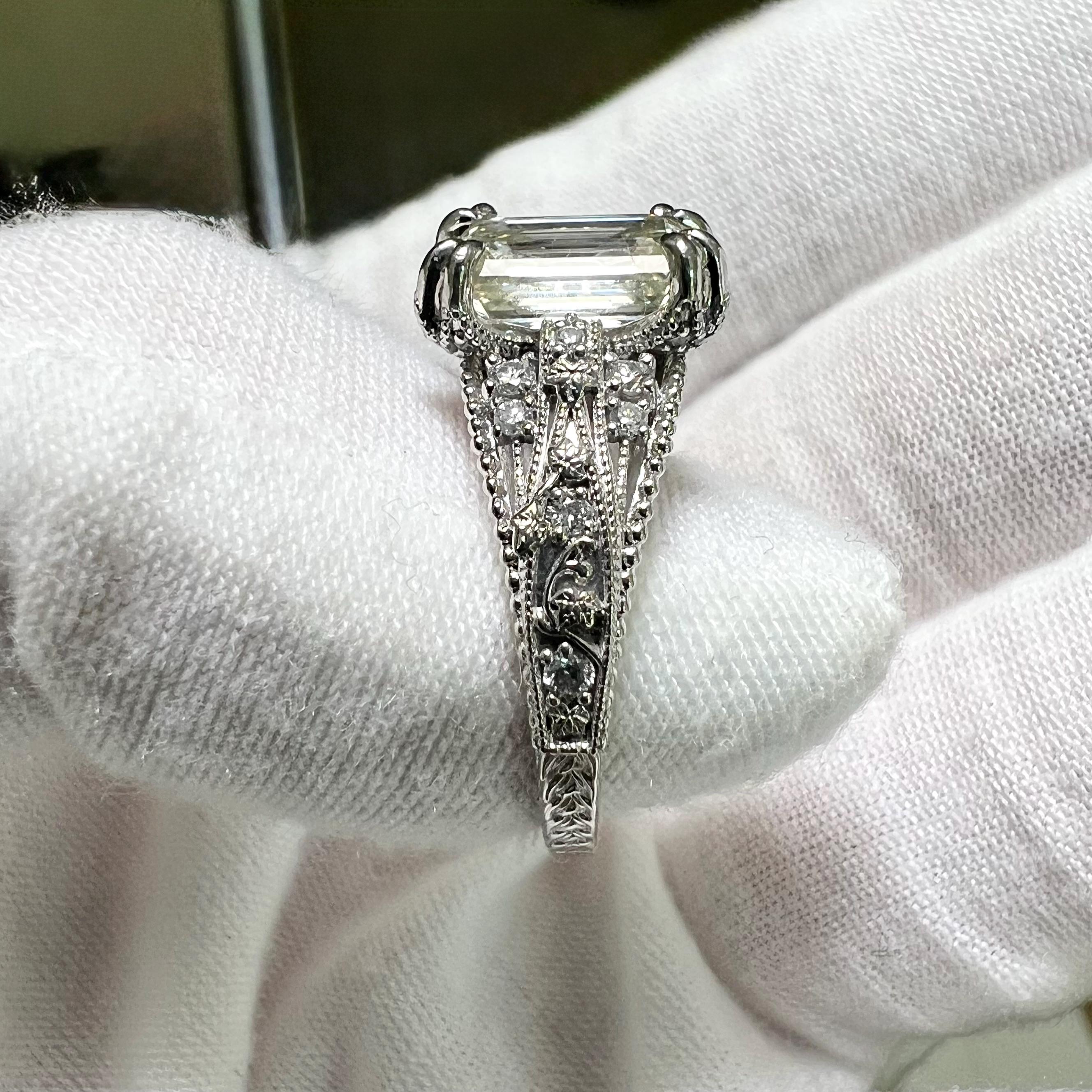 This emerald cut lab grown diamond engagement ring is a bold Art Deco design with a softer, romantic twist. Created with strong geometric lines and delicate ivy detail winding up the sides, this ring blends architectural elegance with a more organic, heirloom-inspired feel.