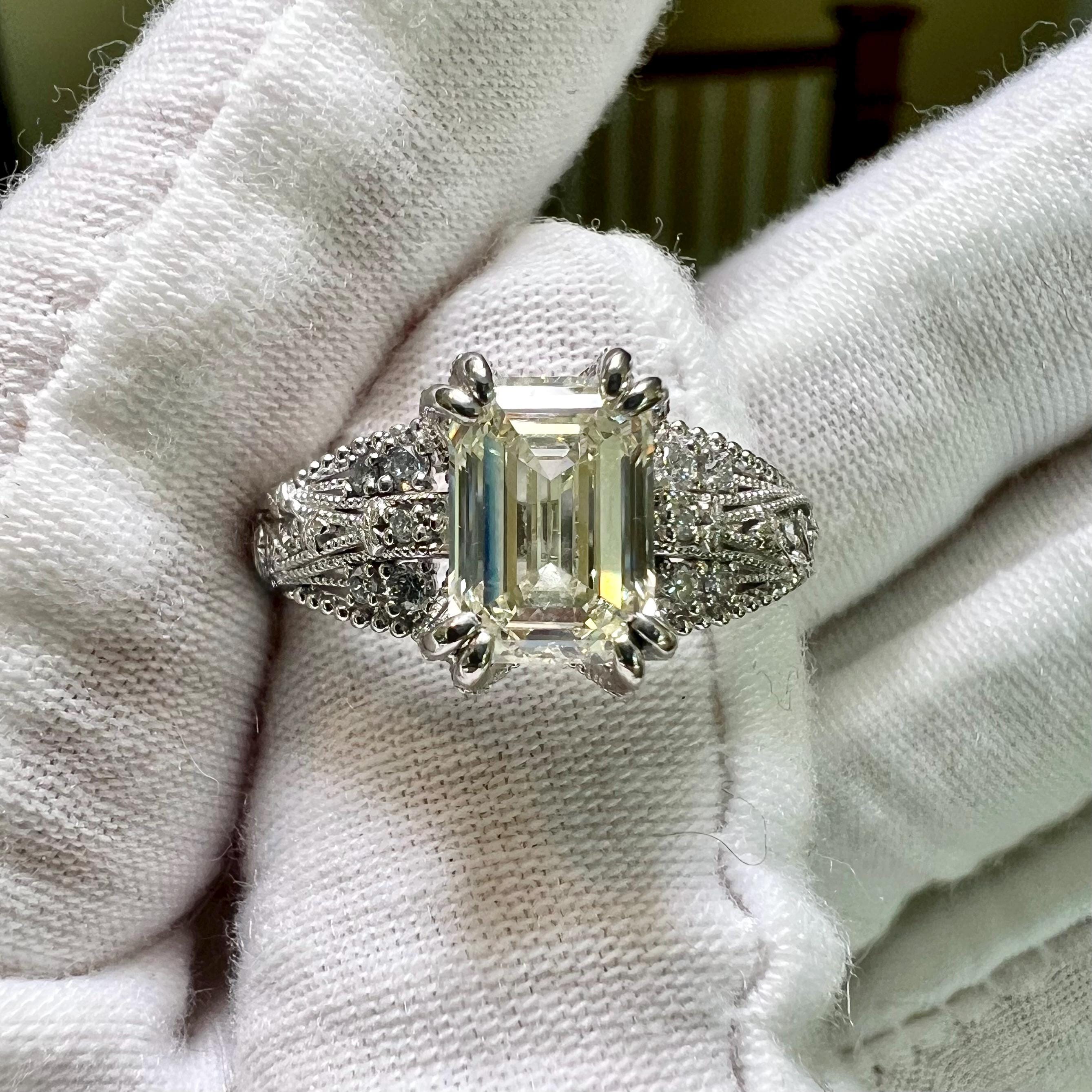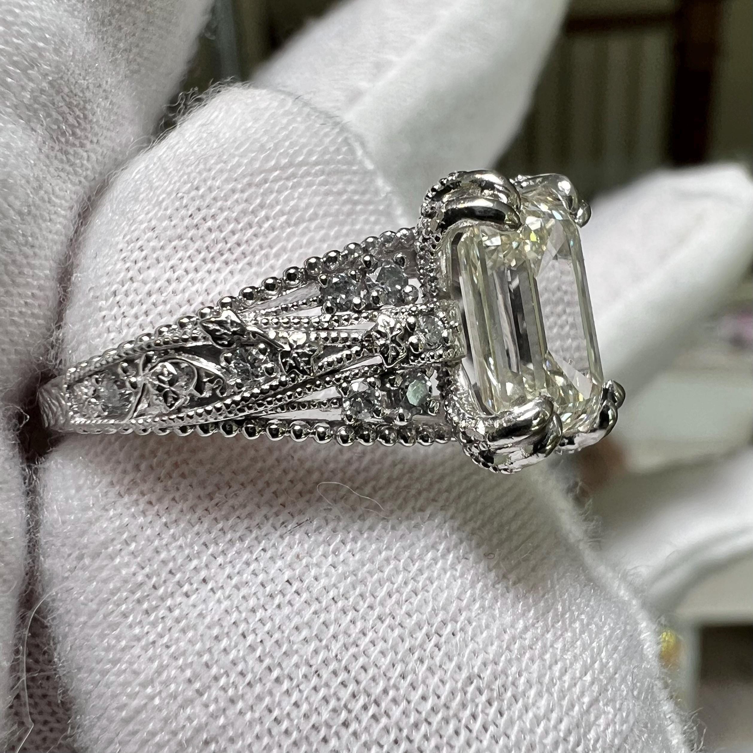 At the center is a striking emerald cut lab grown diamond that gives the ring its clean, elongated presence, while the side details add depth, character, and a beautifully distinctive silhouette. The result is a statement engagement ring that feels refined, unusual, and unforgettable.